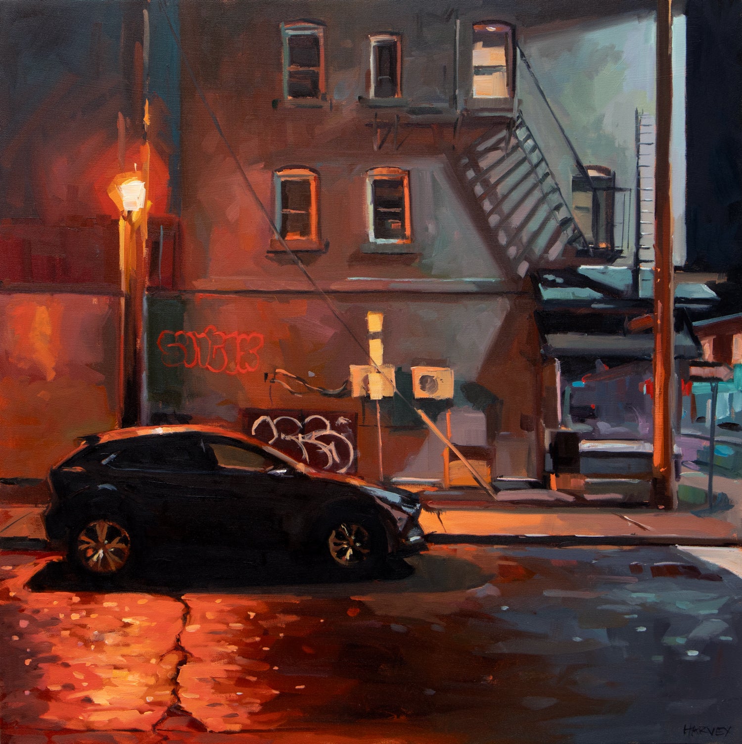 Harvey draws inspiration from a recent visit to the city, focusing on quiet, often overlooked elements of the built environment. Streets, corners, and unremarkable buildings become sites of reflection, offering a fresh perspective on the everyday. His paintings celebrate the subtle beauty found in these spaces, inviting viewers to slow down and engage with moments that might otherwise go unnoticed. -