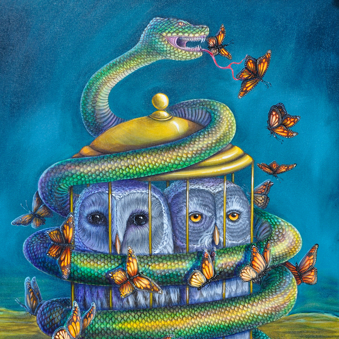 Wall Space Gallery is proud to present Drew Mosley’s latest solo exhibition “Biophilia”. Biophilia refers to the deep human desire to commune with and be integrated in nature. Mosley’s compositions in acrylic on canvas address our contemporary environmental crisis through the delicate relationships between various lifeforms; at times engaged in literal balancing acts, and others a symbiotic agreement. -