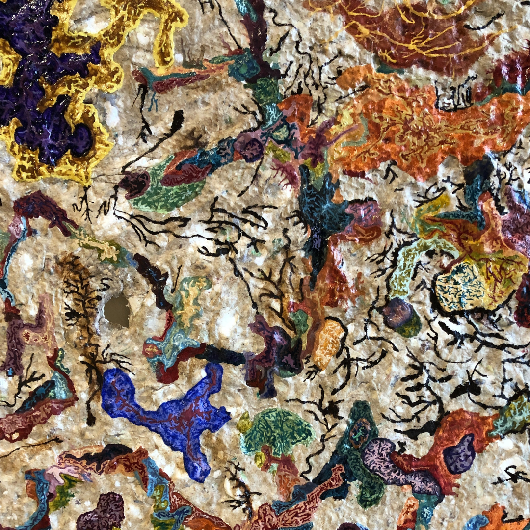Continuing experimentations with extreme limitations of ecofriendly materials such as wax, soot, eggs, recycled paper, and textiles.