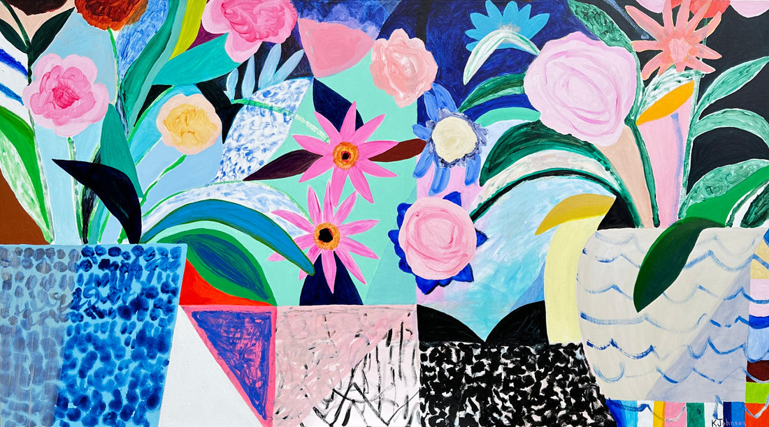 Wall Space Gallery is proud to present a curated selection of works by Toronto-based painter Kaitlin Johnson. Tackling floral and abstract compositions with vibrant palettes and patterns that vie for attention, Johnson brings the representational into competition with the abstract. Infusing blocks of colour in-between petals, pots and leaves she creates energetic moments of contrast. Her paintings inspired from textile patterns mimic the patch-work of quilts, use discordant patterns and marks to create joyously balanced-chaos.
