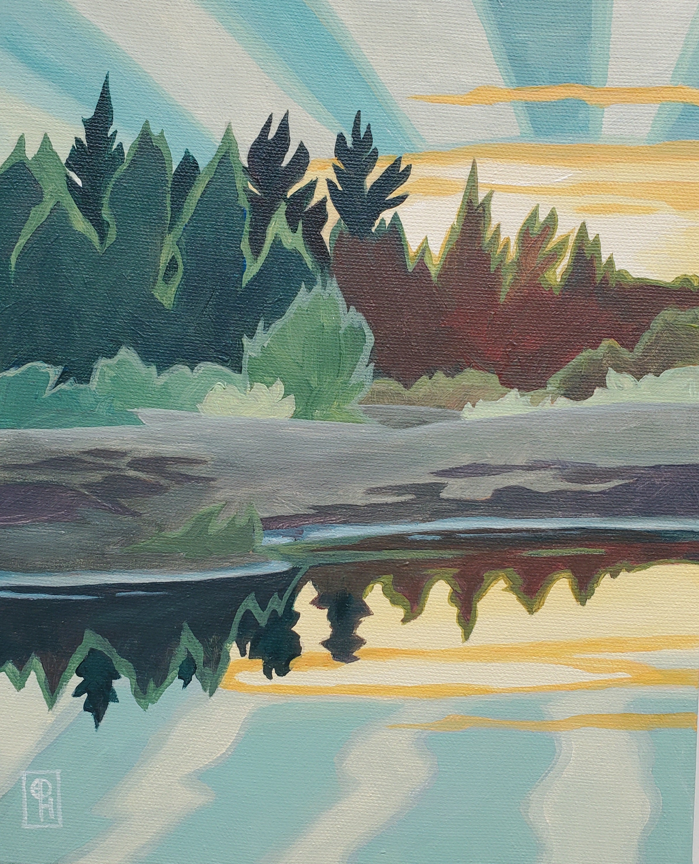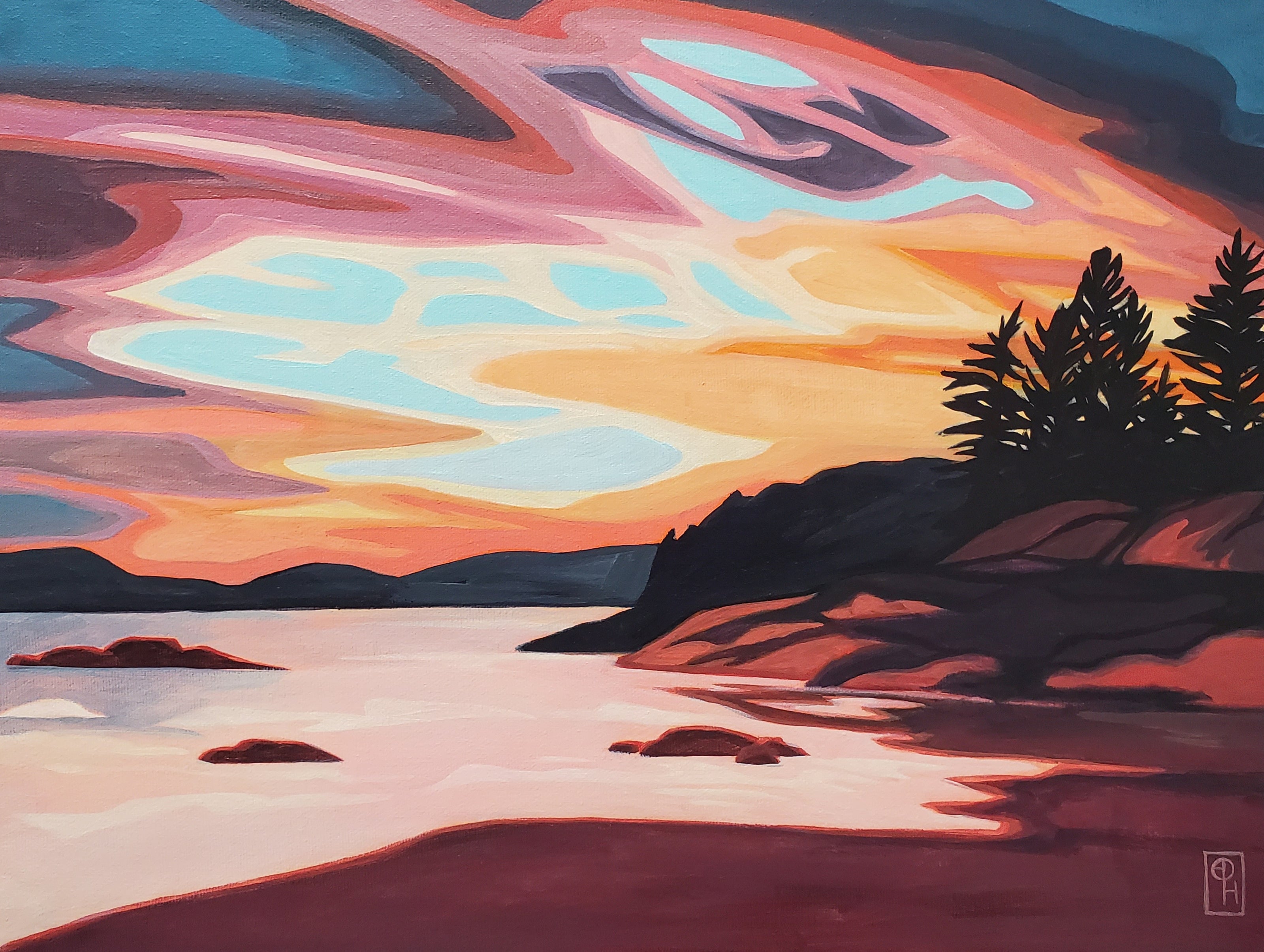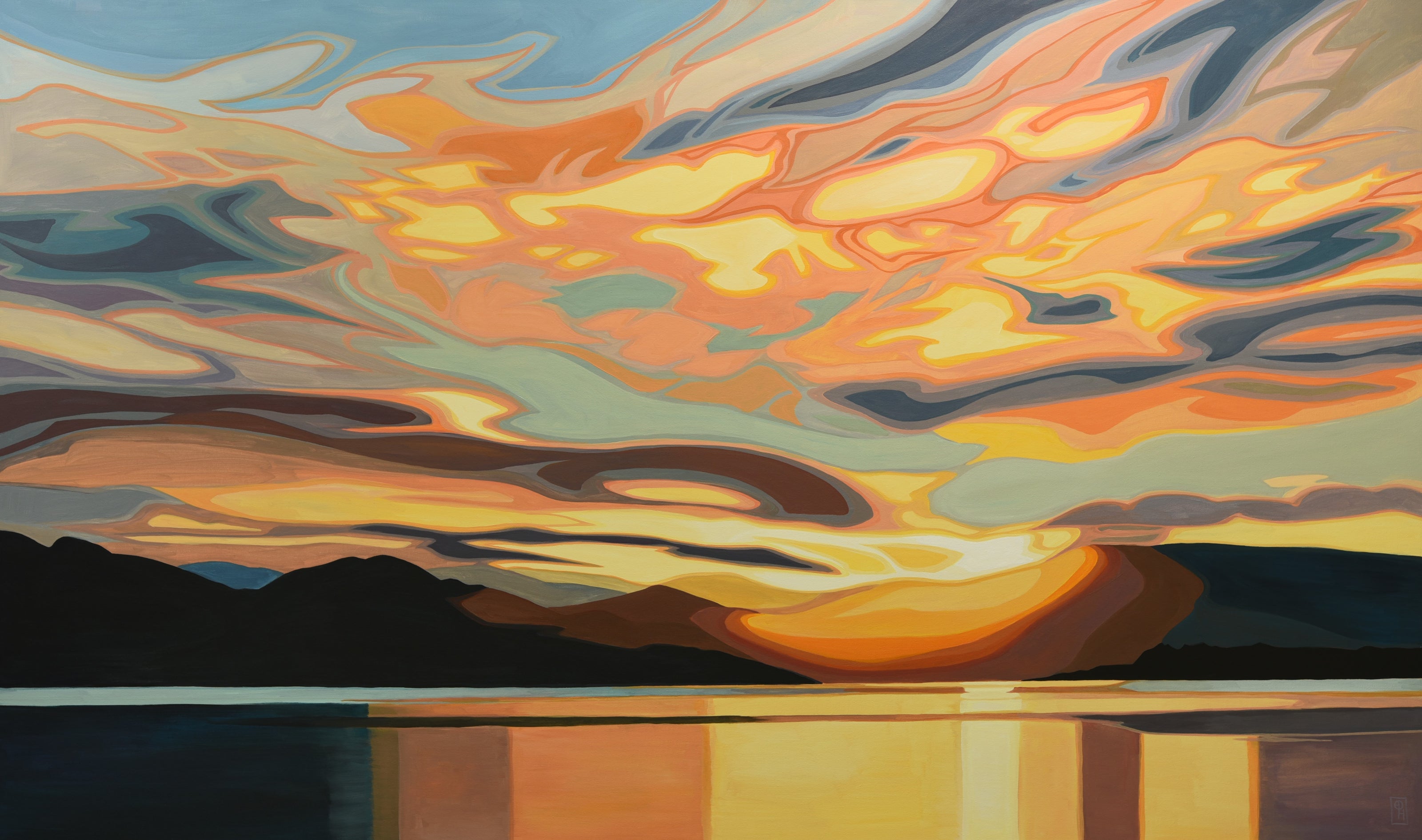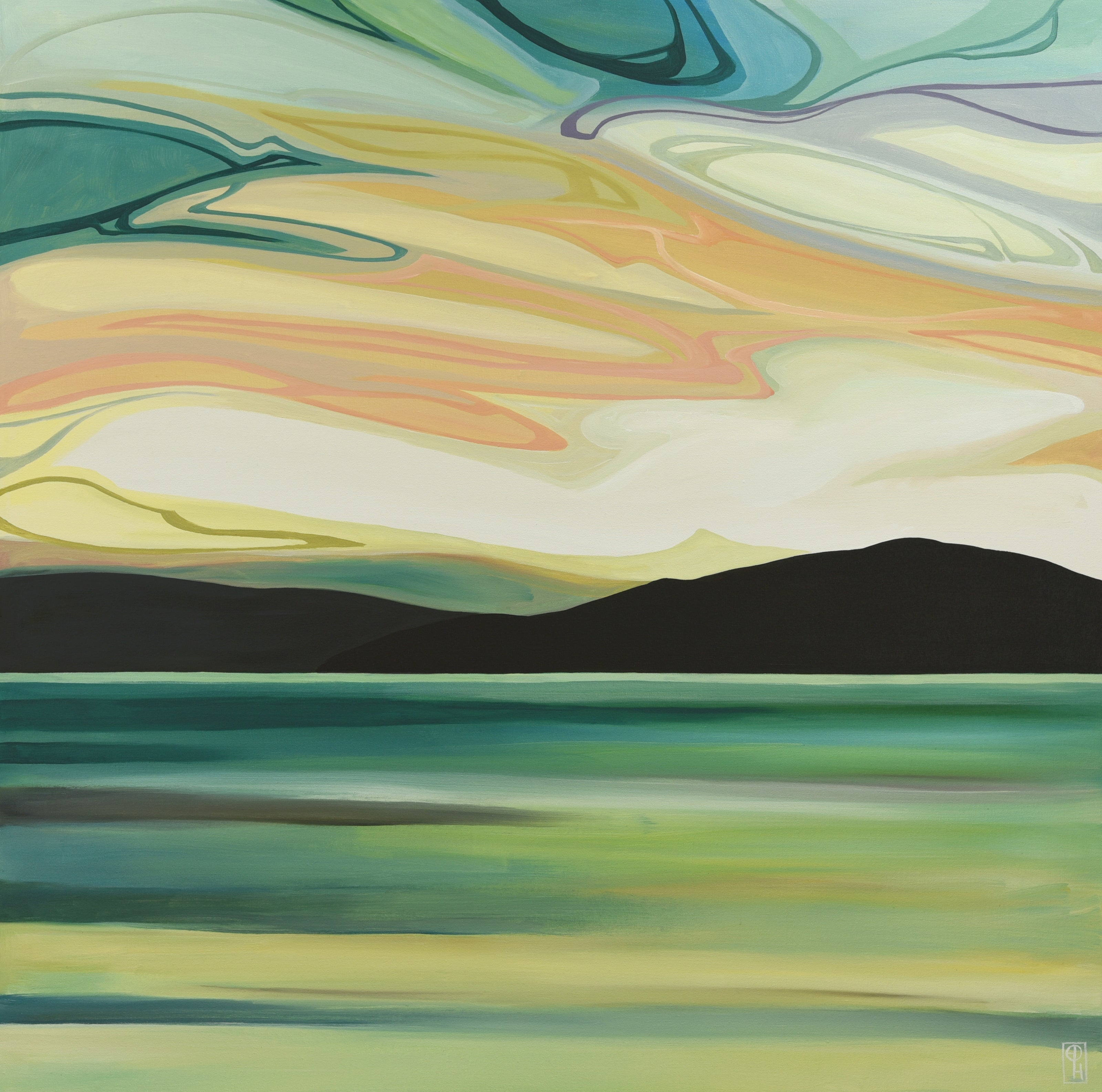 Works by Erica Hawkes express a distinct West-Coast aesthetic in their vistas, luminous colours, and boldly contoured shapes. Hawkes fuses influences from 20th century art movements including Art Nouveau, Cubism, and the Group of Seven with her BC roots. Rolling mountains, billowing clouds and reflective expanses of water are captured as impressions for the viewer through the use of sharply angular, or elegantly sinuous, fields of colour. Hawkes' paintings emit their own inherent glow that immediately calls and holds our attention.