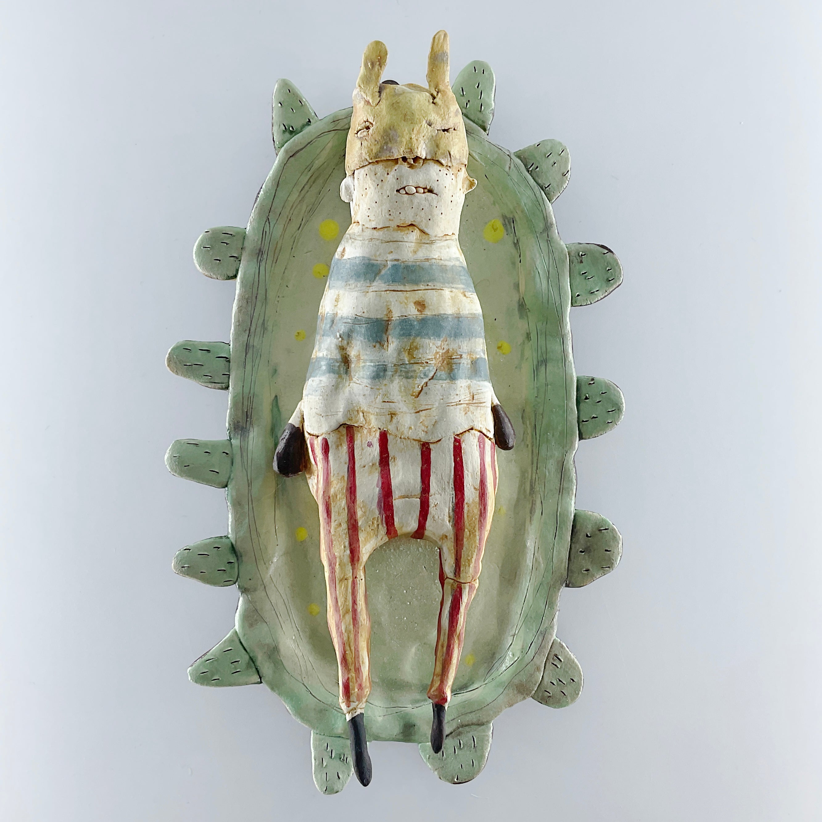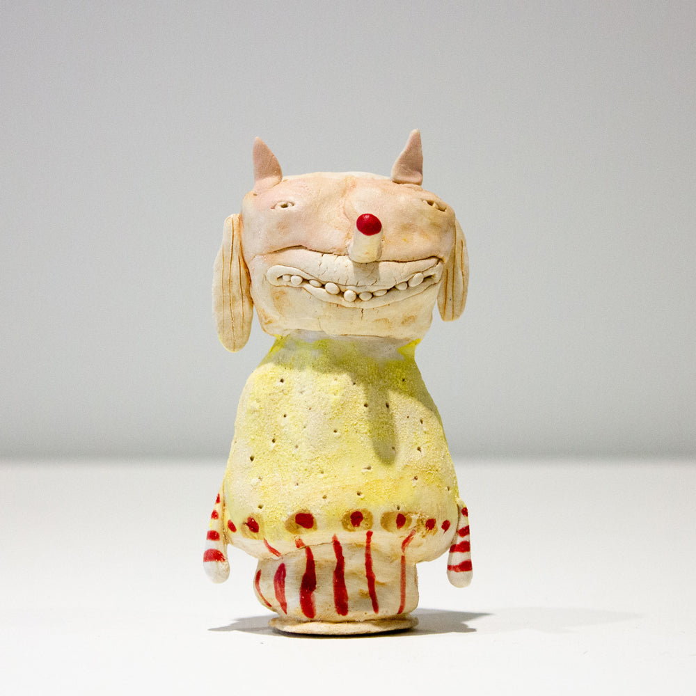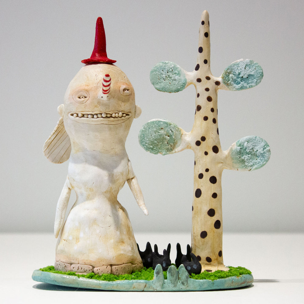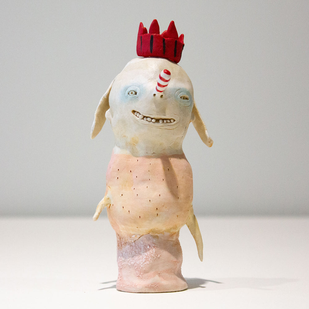 Jeannie Pappas’ works embody the conflicting psychological and emotional states that we experience. Adopting figurative sculpture, most often in clay porcelain with light washes of underglaze, Pappas evokes the tensions that persist between body and mind, playful and horrible, grotesque and endearing. Her figures are at once strange and familiar, personal and archetypal, inscrutable and intimate. In each case, the artist motions toward narrative, as if her strange creations are embroiled in some drama. Yet, this is suggestion only; the power of these artworks lies in our ability to write the story ourselves. While resolved as figures, the works of Jeannie Pappas remain pregnant with possibility, malleable to the activity of the viewer.