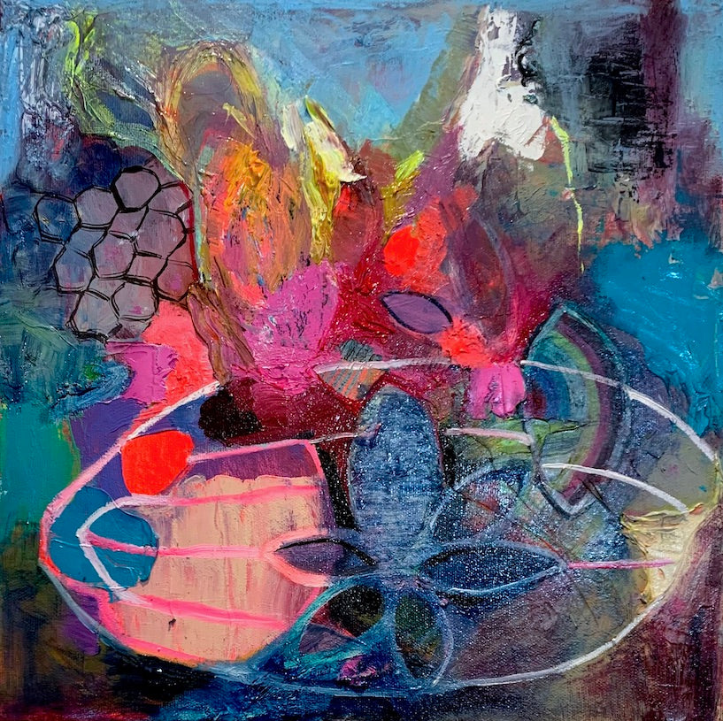 Julie Gladstone is a Canadian Interdisciplinary artist well known for her abstract painting and installations, while also working in drawing, photography, sculpture, knitting, embroidery, textiles, music, performance and DIY video work. Her practice involves collecting contemporary artefacts, creating altars, amulets, spiritual couture and garments for rites of passage around motherhood, and inventing contemporary ceremonies for healing.