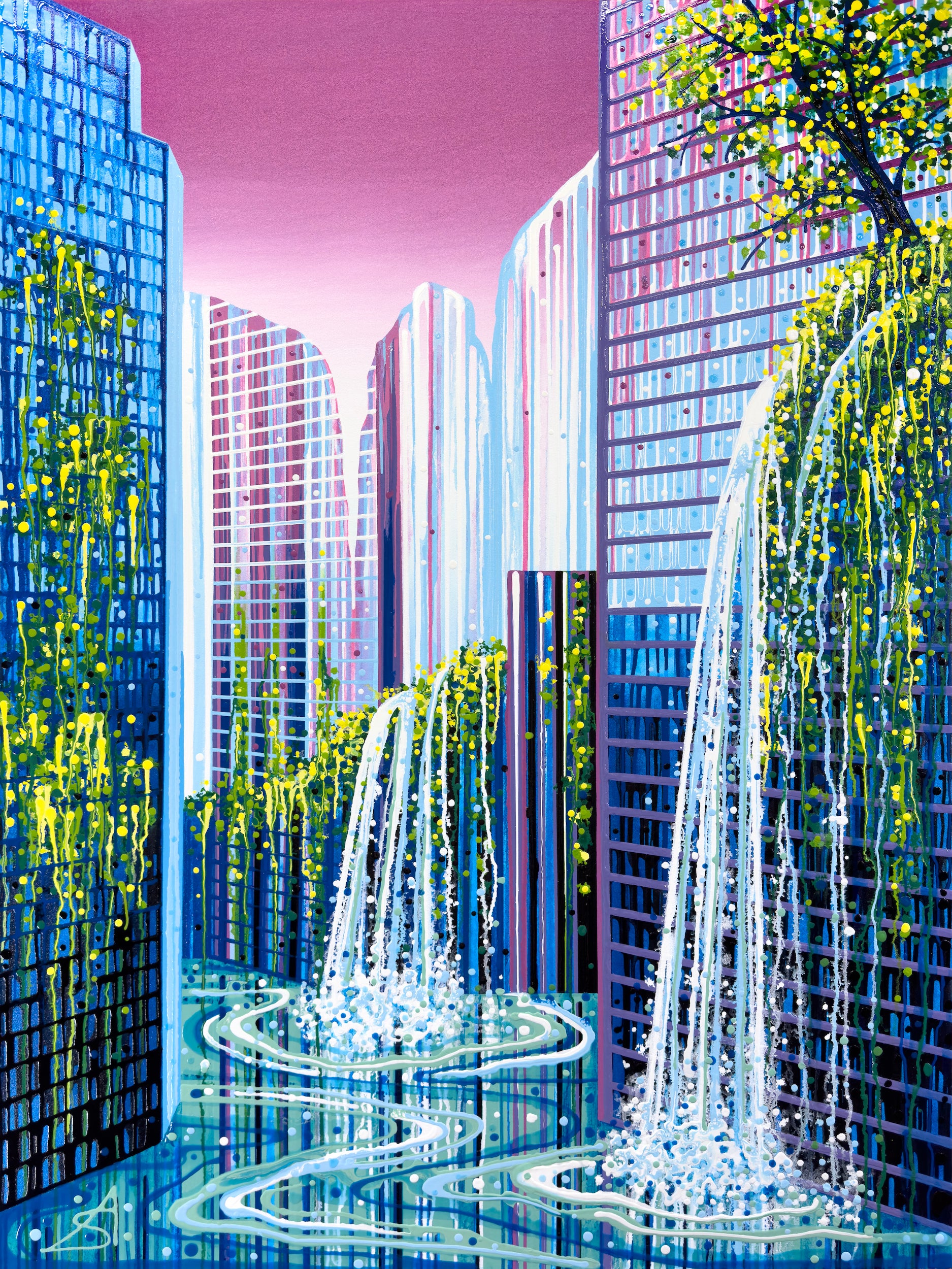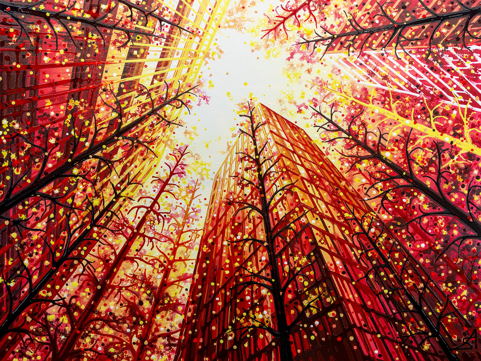 "Initially, I used highly saturated colours to express my optimism for a bright and colourful future. However, after having children, I became increasingly concerned about the world we're leaving them. Although my colours remain vibrant, their meaning has evolved to signal alarm and urgency. Some of my work evokes feelings of unease, while other pieces envision a beautiful world where nature and humanity are working together. By depicting both of these potential futures I want people to stop and think about the relationship between nature and cities and its impact on us all."