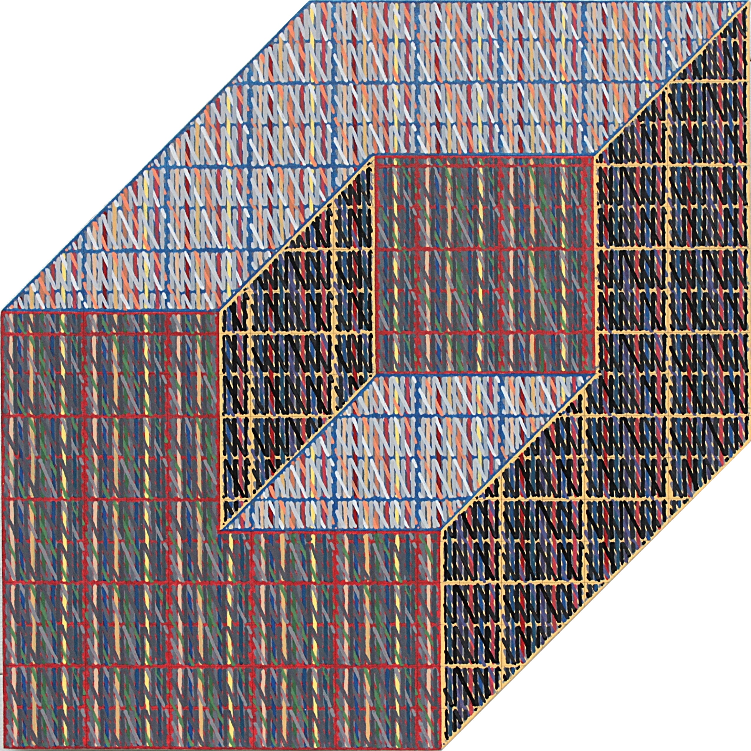 In ChPl III – 34: Dark Façade, Penry captures the luminosity of what could be a stained-glass window illuminated at night. He navigates luminosity and colour through a technique similar to optical mixing, allowing flecks of underlying colours to be glimpsed through one another, reminiscent of the style used historically by impressionist painters to capture light and atmosphere. The layering of colour side by side combines visually to create vibrational relationships between colours. His intricate woven canvases are evocative of tapestries or lines of matrix code, placing his imagined structures between a digital rendering and the tangibility of textile.