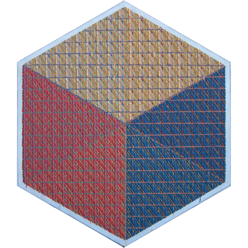 and creative standpoint. Much like architectural drawings, Penry's build-up of forms and colours gradually emerges from the meticulous application of lines. He finds intrigue in the laborious application of acrylic paint in thread like strokes that visually intertwine with one another, slowly