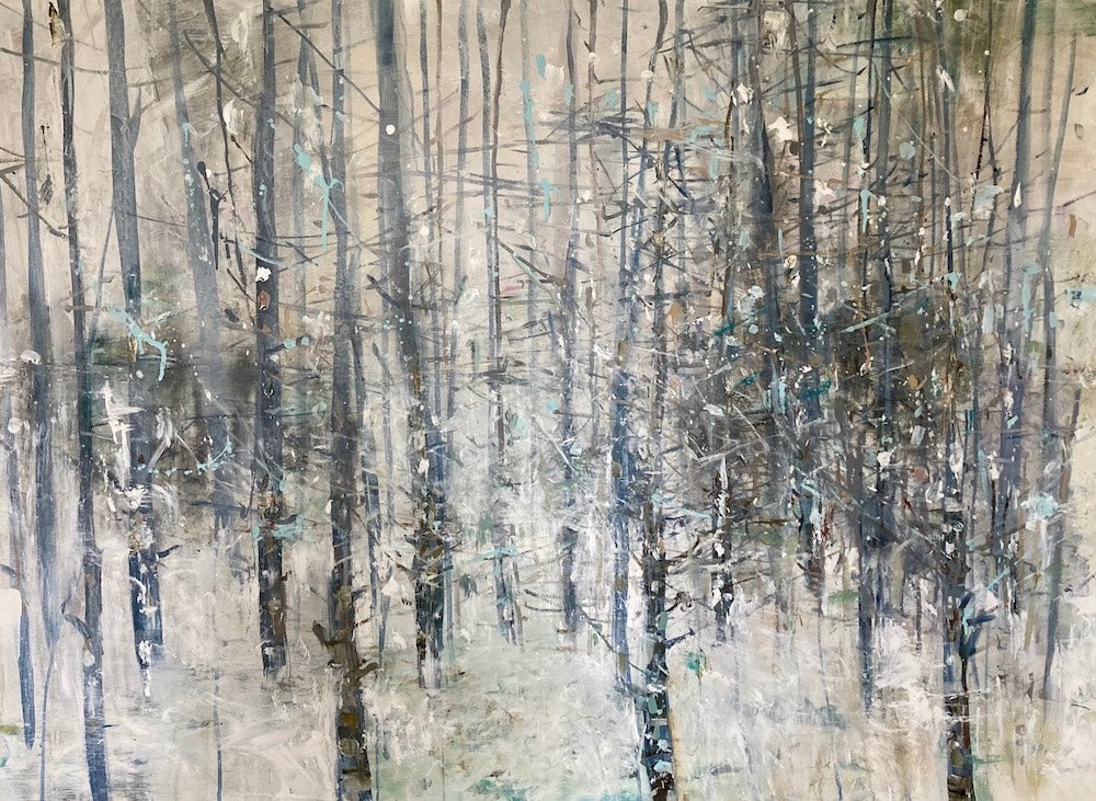 Striking a balance between these extremes is Ryan’s Quiet Chill whose implied horizon becomes obscured in what might be snowy billows. Unable to see where the tree line ends, the horizon could expand forever, while the encircling trees interweave into a veil of expressionistic gesture and colour across our path.