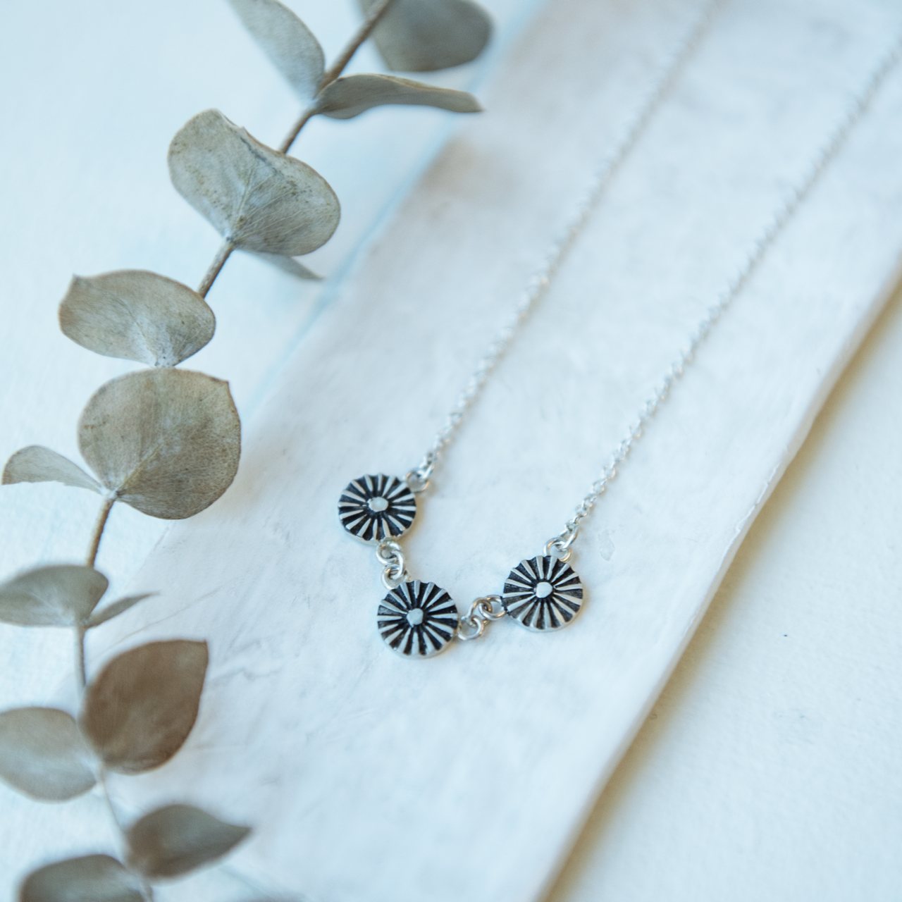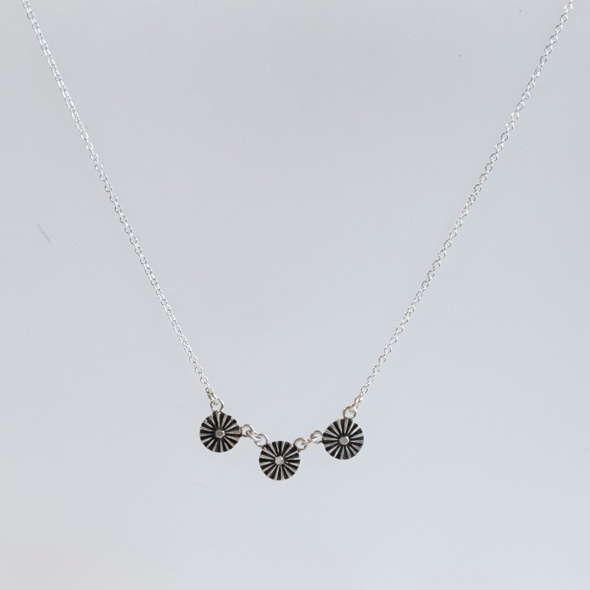 Sterling silver chain with three silver pendants with oxidized silver radial line pattern
