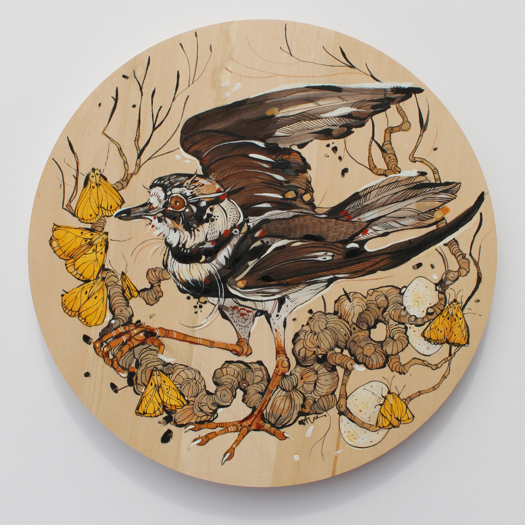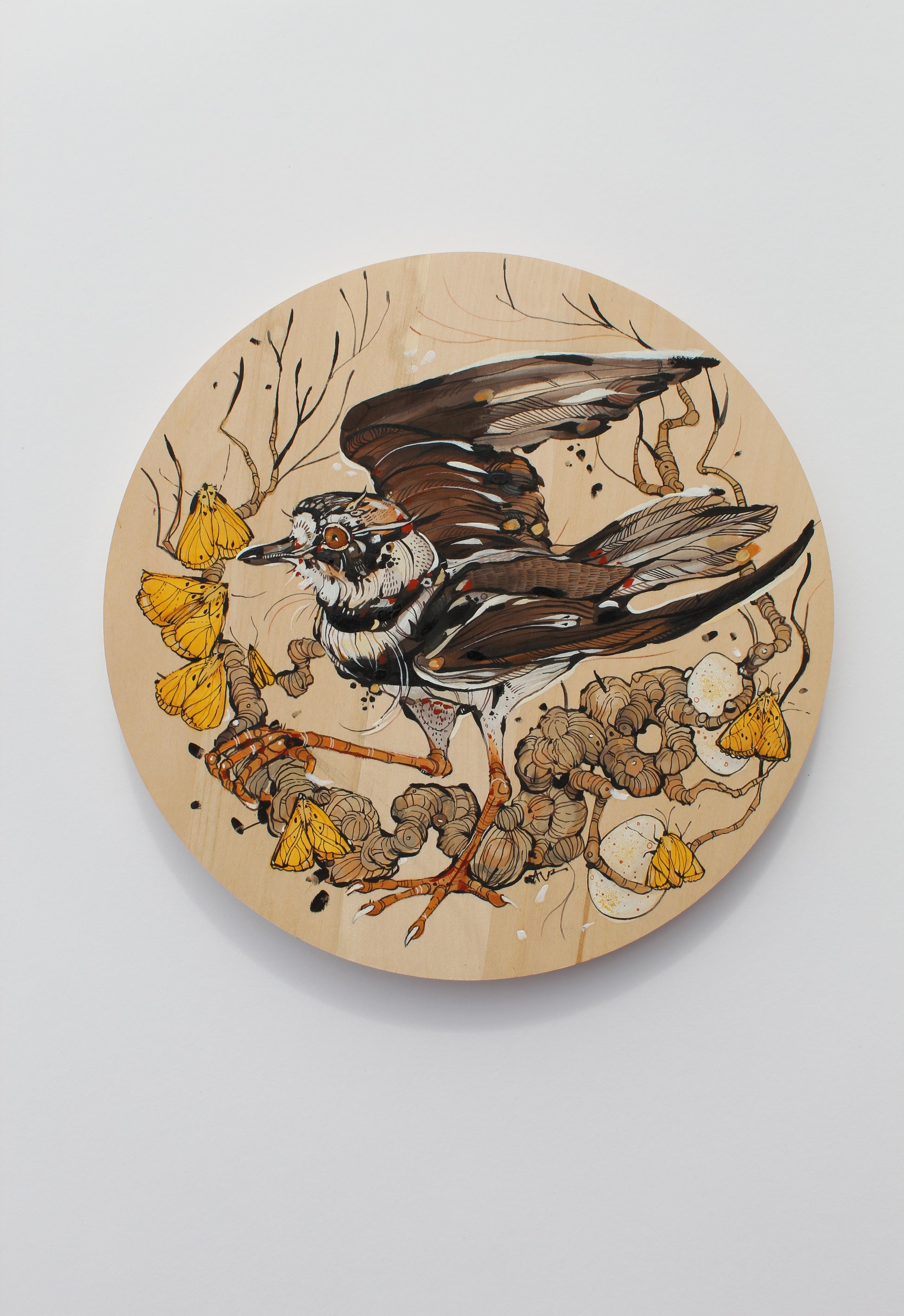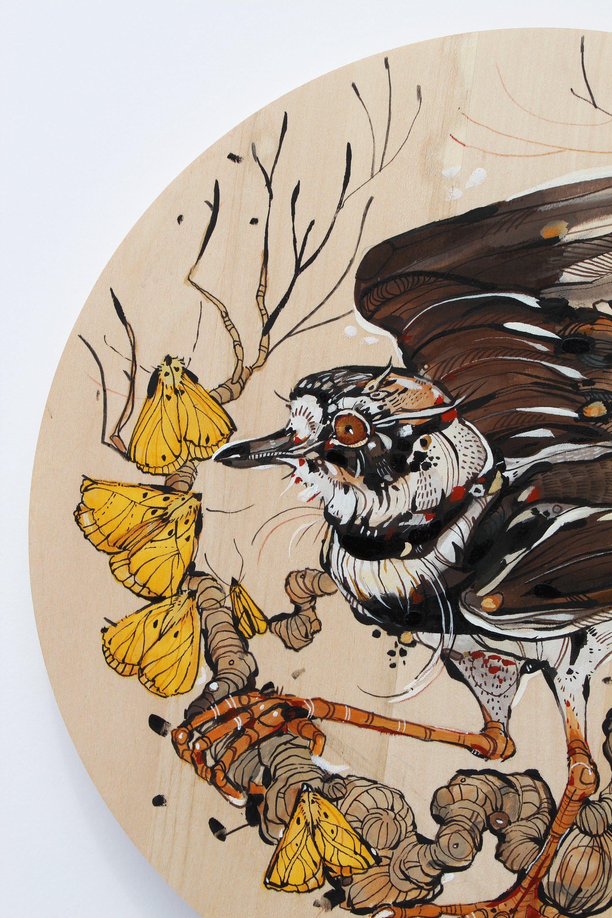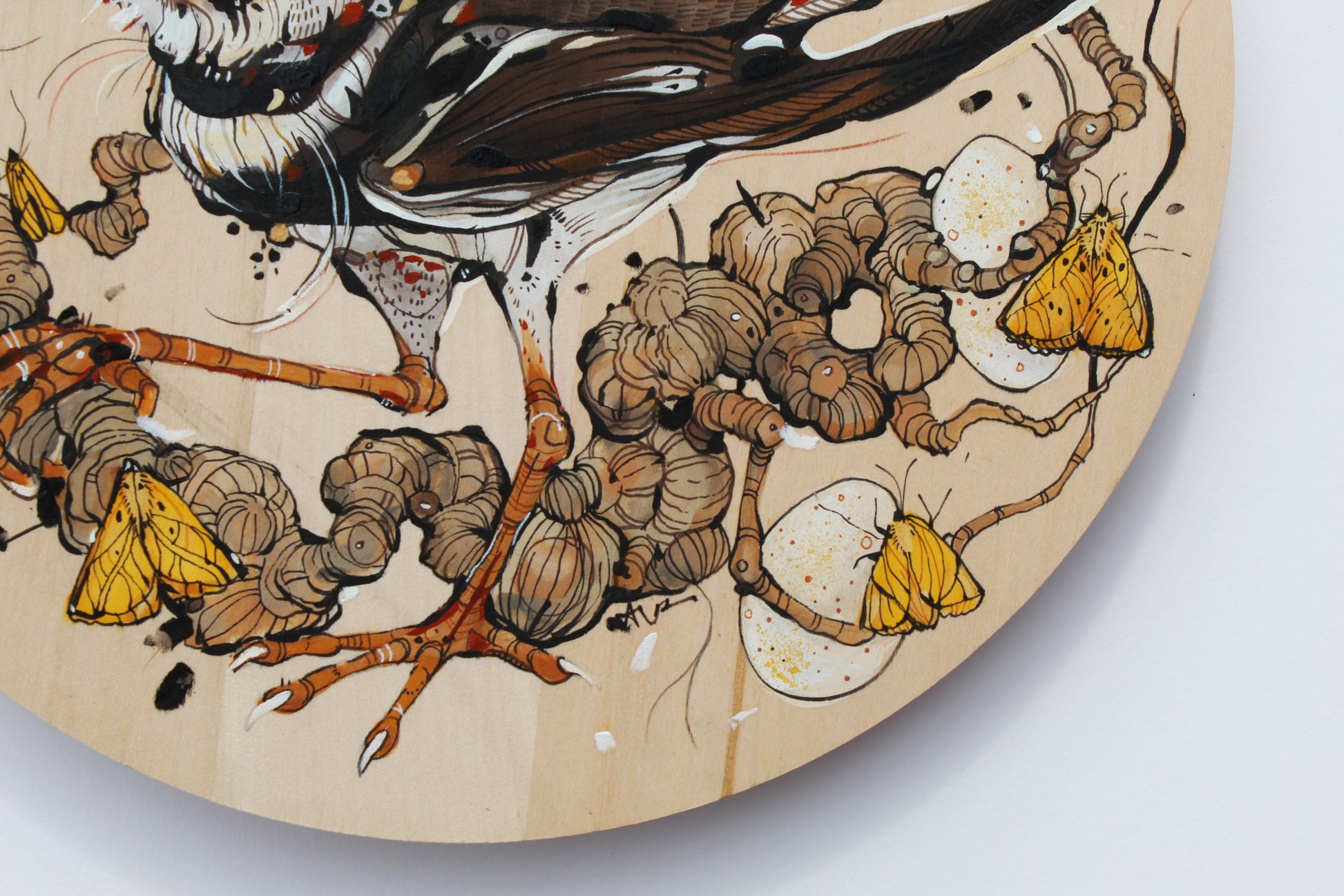 Acrylic paint, oil pastel, pen and ink on round panel