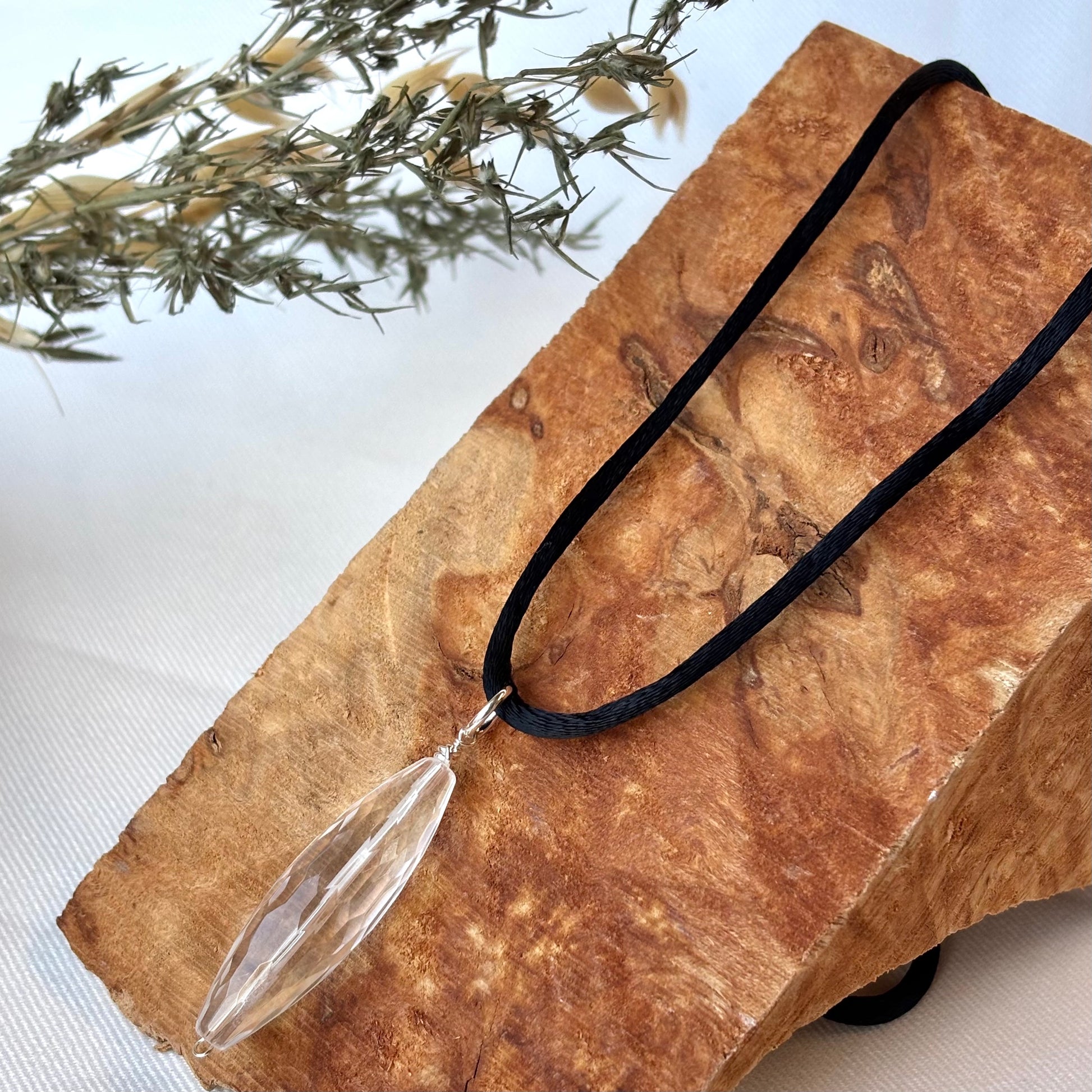 Facet cut marquise quartz crystal pendant on a black satin cord with a silver plated pewter toggle clasp