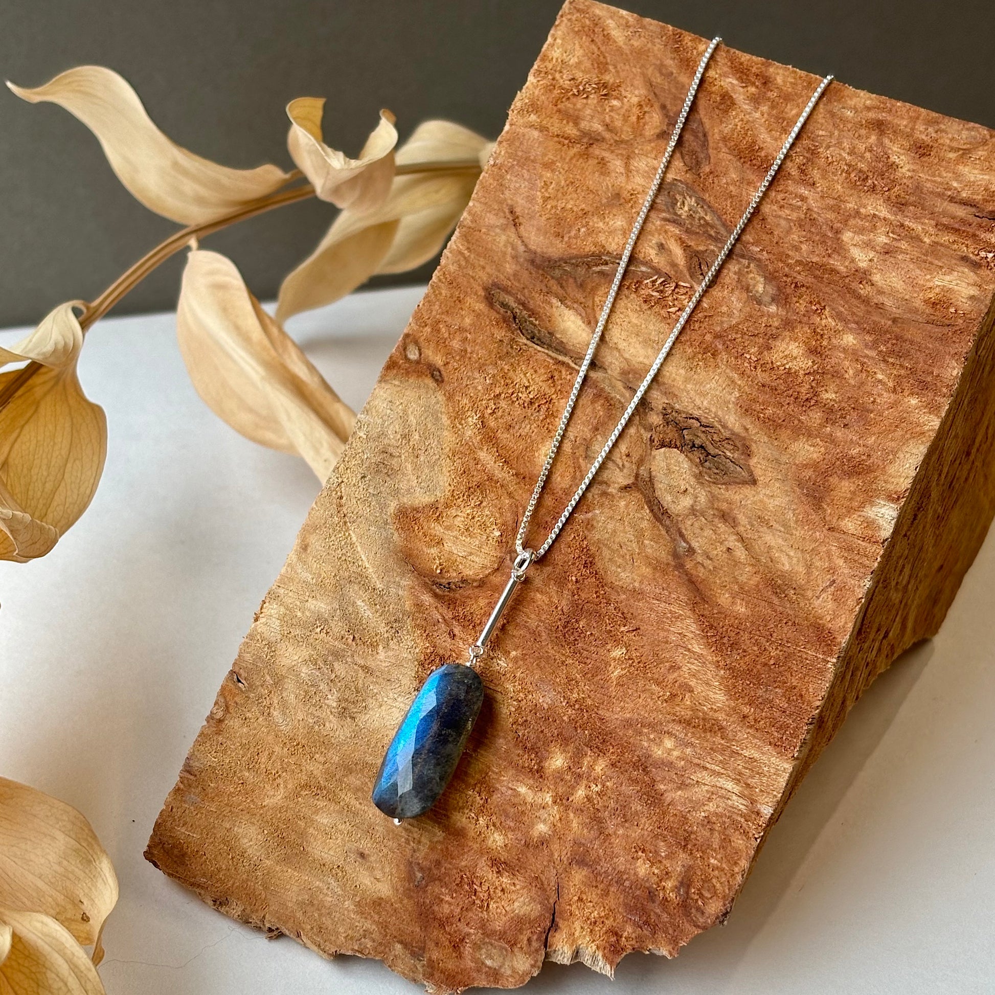 Facet cut labradorite pendant with sterling silver rod on a sterling silver box link chain with a sterling silver trigger clasp