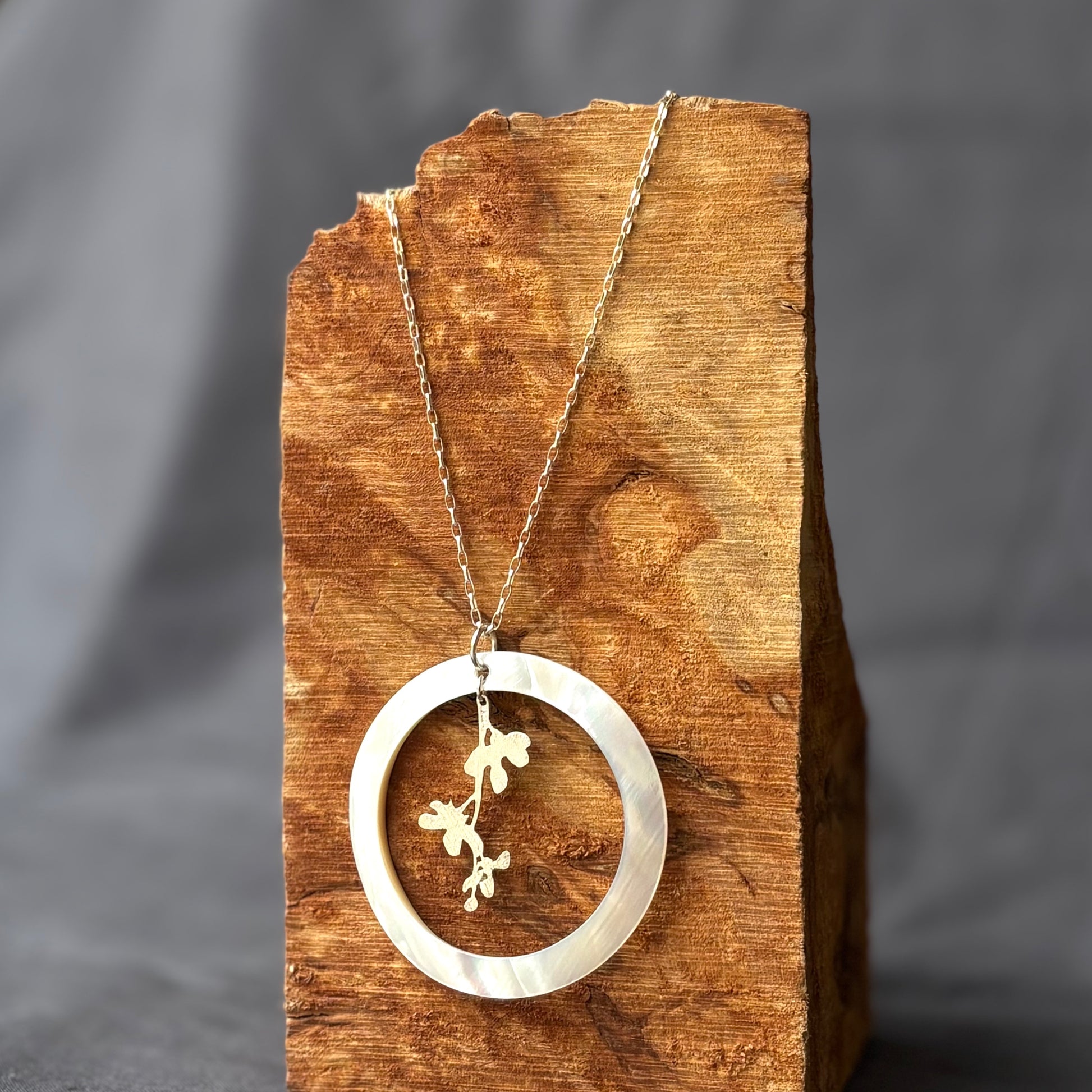 Large Mother of Pearl circle with brushed sterling silver floral motif and sterling silver small oval link chain with a sterling silver trigger clasp. Can be worn with the chain doubled.