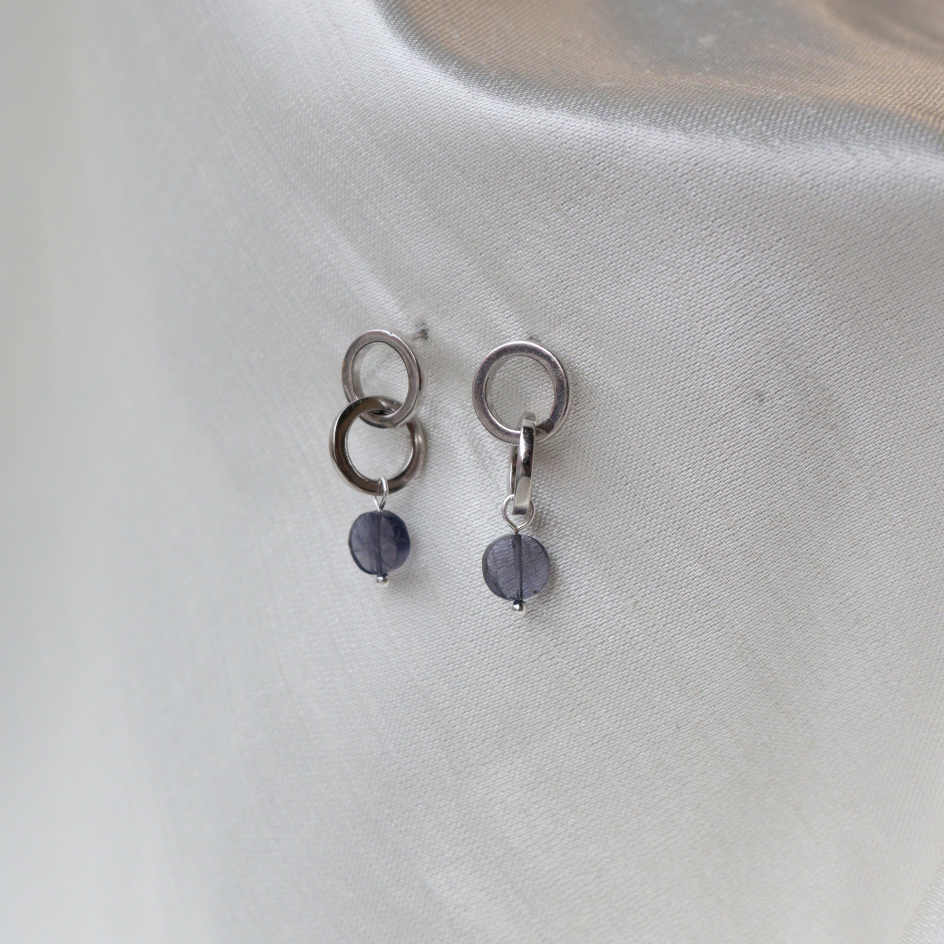 Rhodium plated sterling silver stud dangle earrings with round iolite gemstones on sterling silver studs.