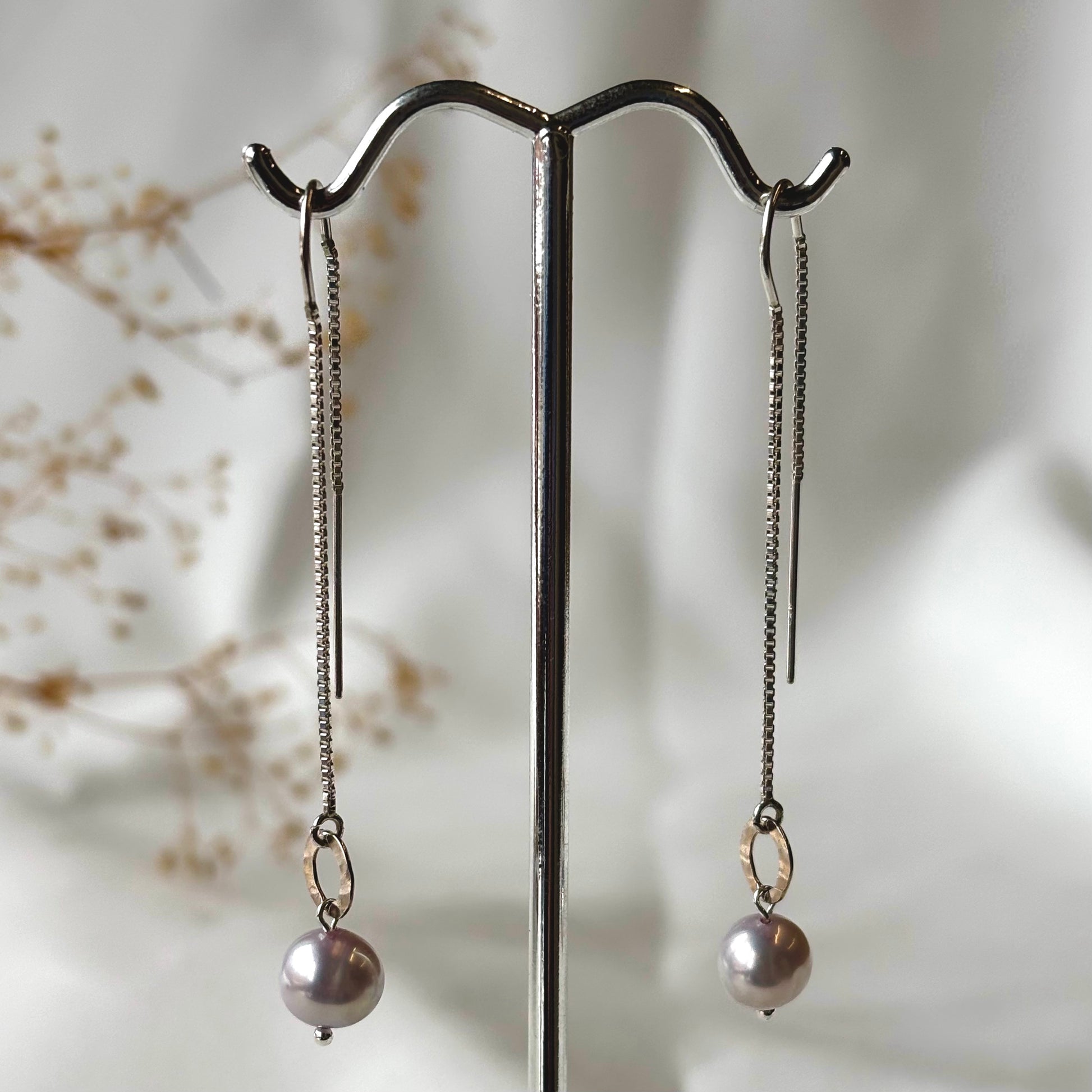 Sterling silver pull through chain earrings with hammered sterling silver circles and pale lilac round pearls