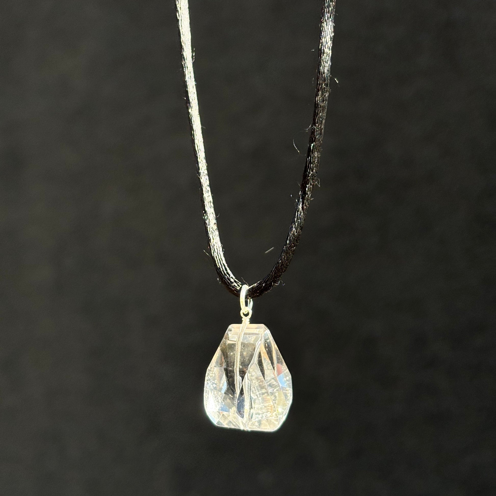 Large facet cut cube quartz crystal pendant on a black satin cord with a sterling silver trigger clasp