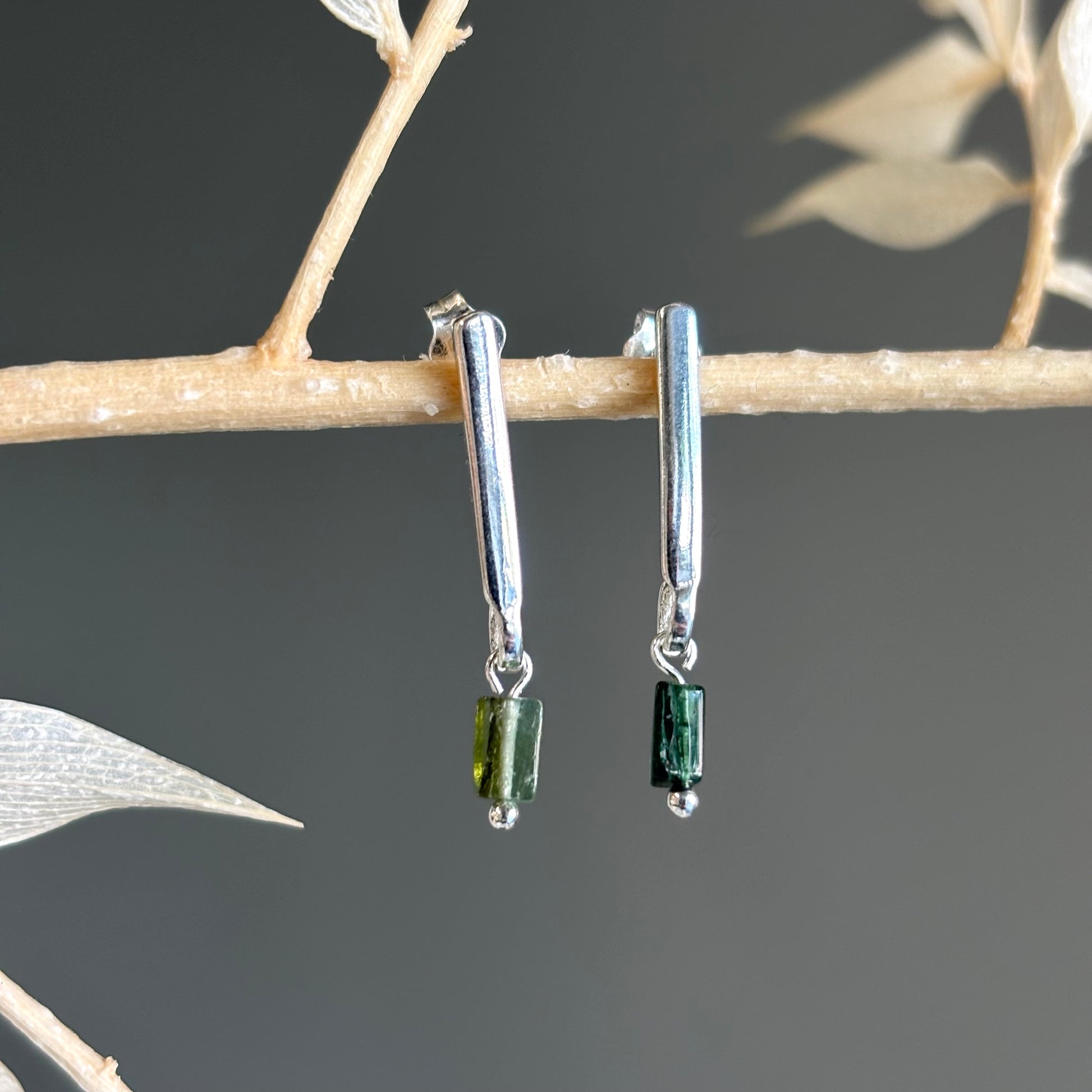 Sterling silver rectangular stud bar earrings with a mismatch green tourmaline gemstones.