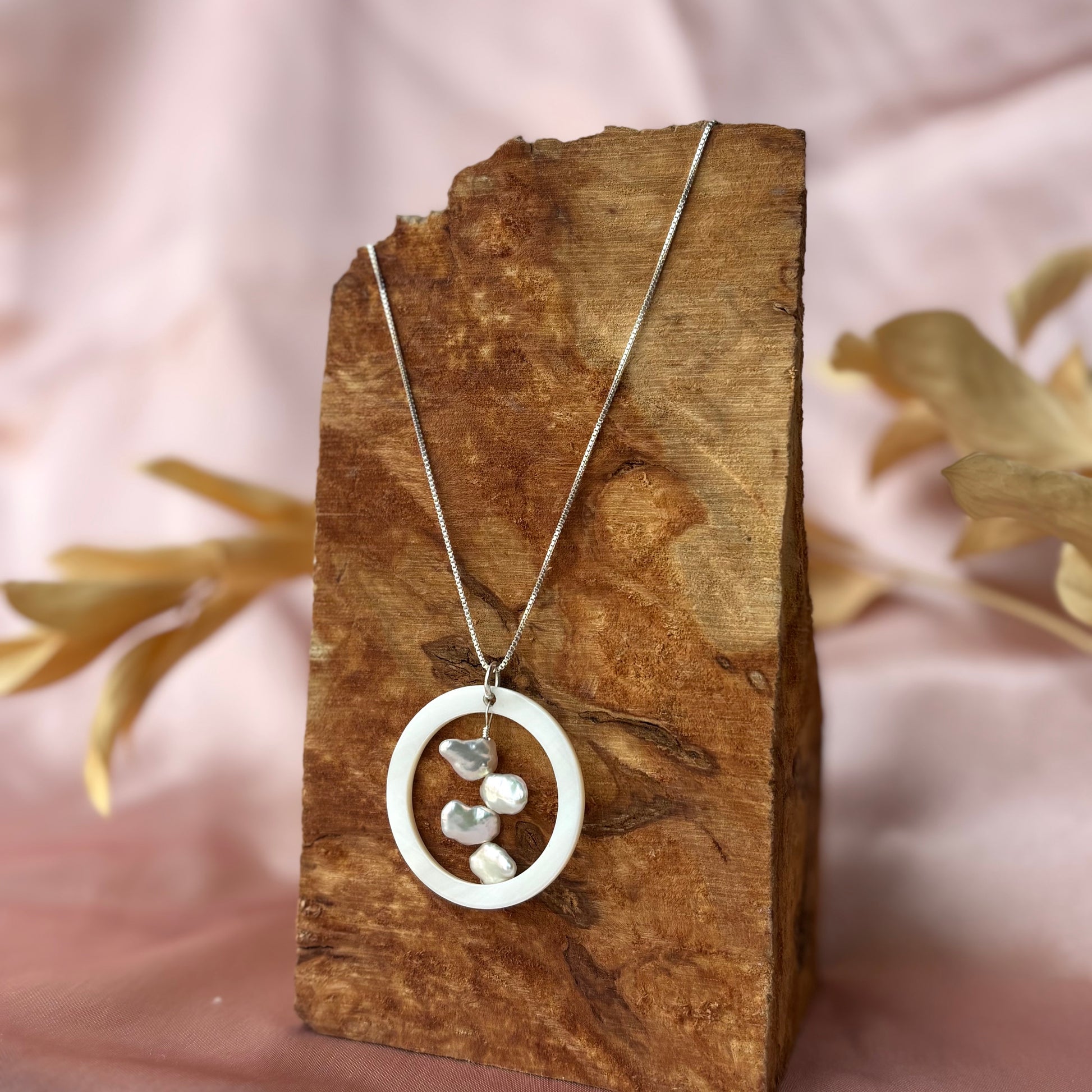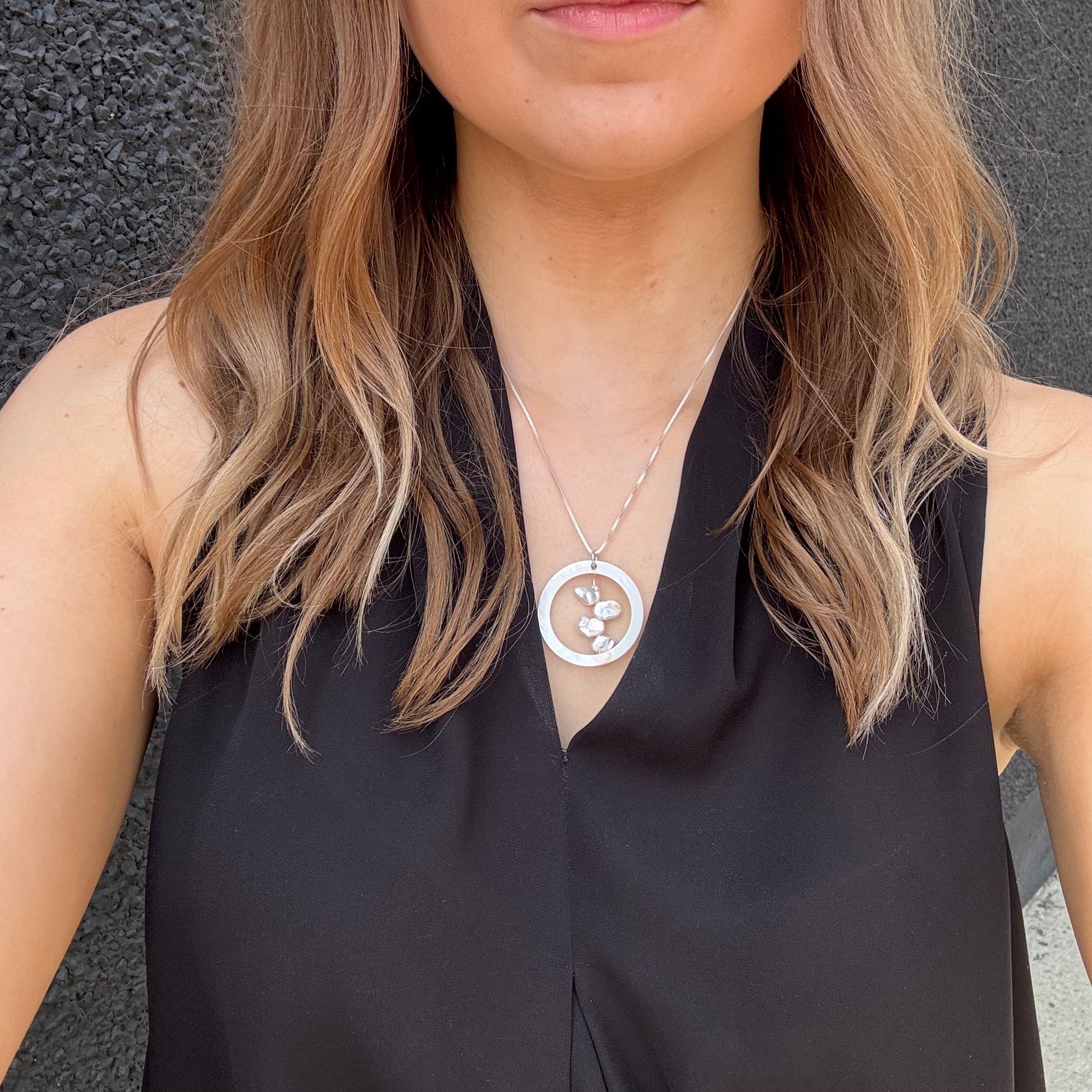 Large Mother of Pearl circle with four stacked keishi pearls on a sterling silver box link chain with a sterling silver trigger clasp trigger clasp