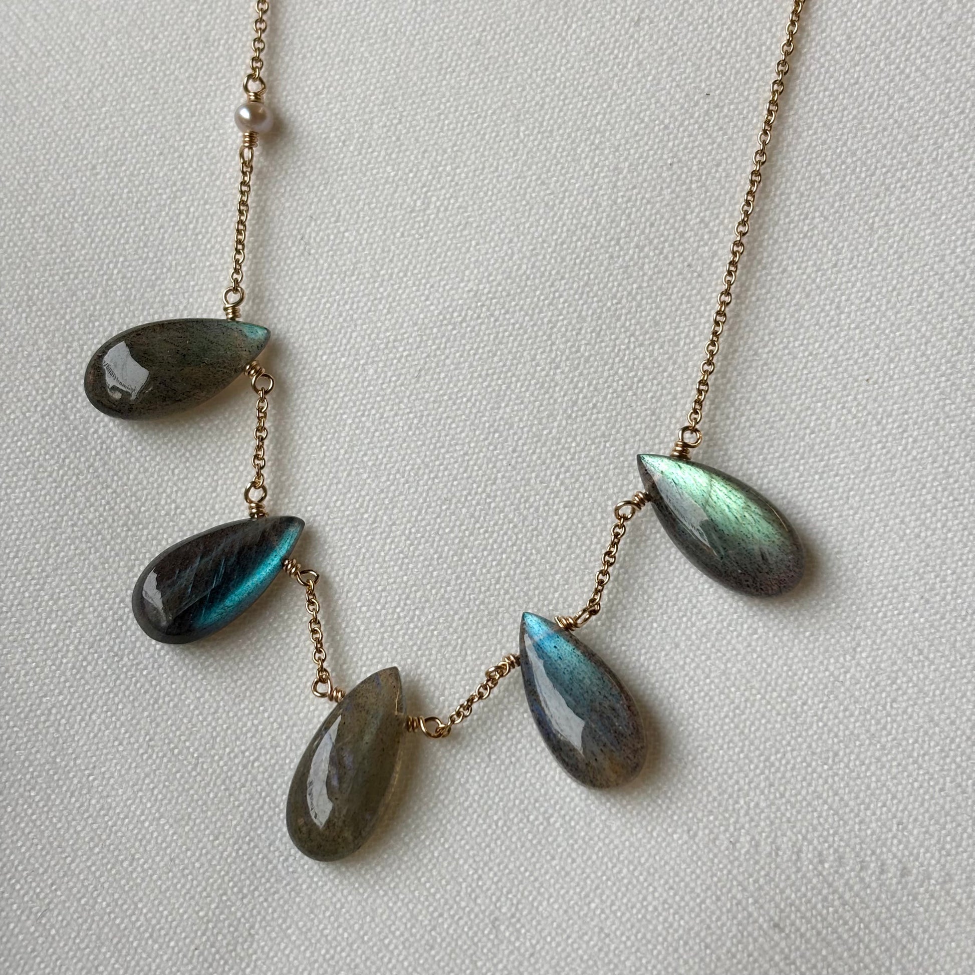Five labradorite gemstones with freshwater pearl accent on a gold fill chain.