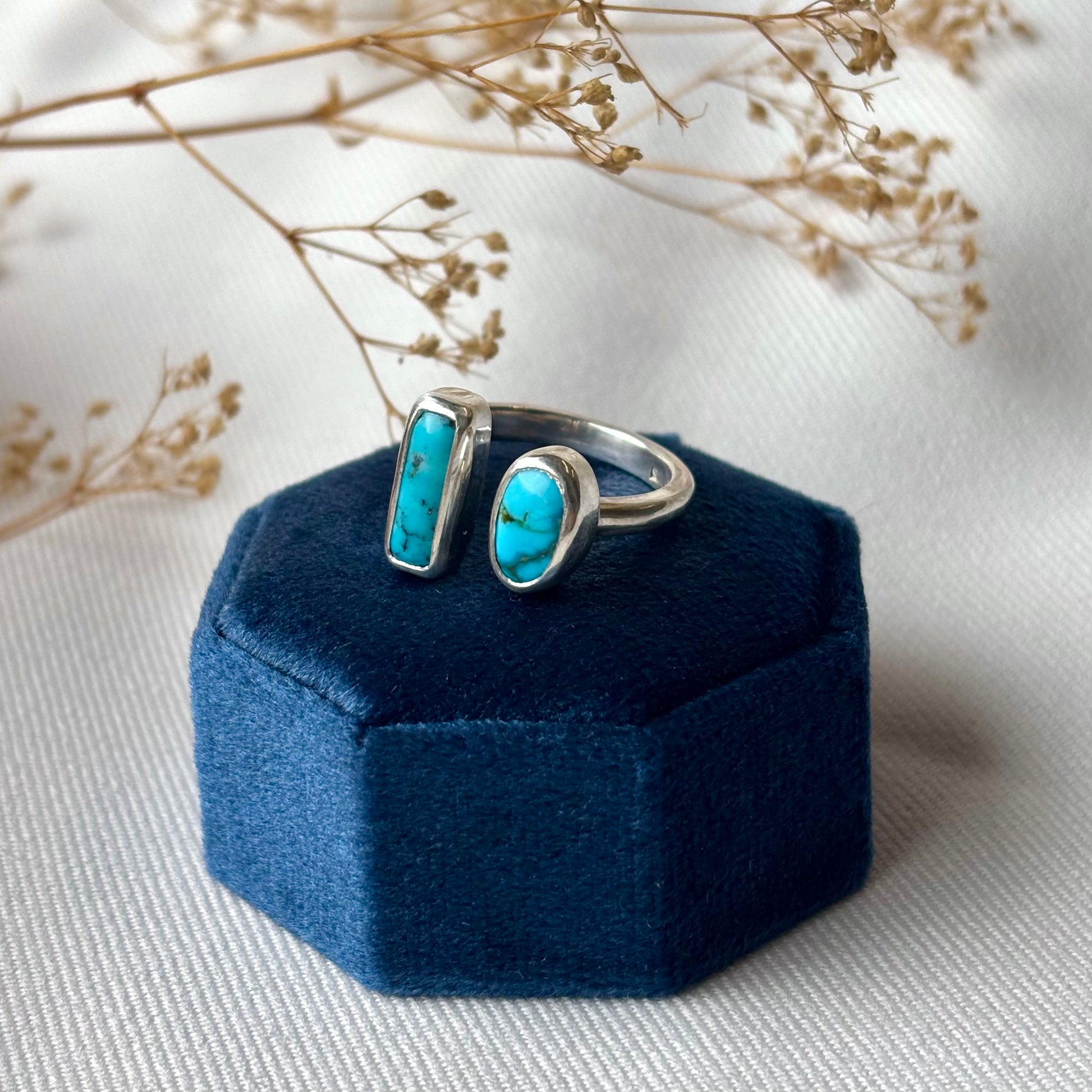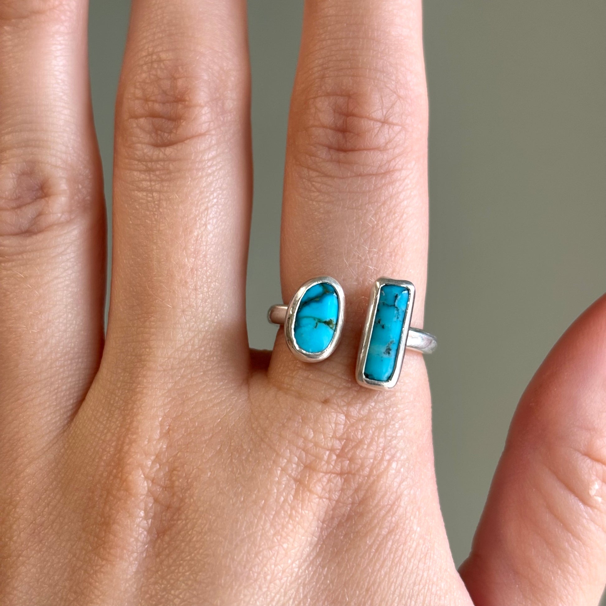 Asymmetrical open ring with turquoise stones, one circular and one rectangle, on a sterling silver band