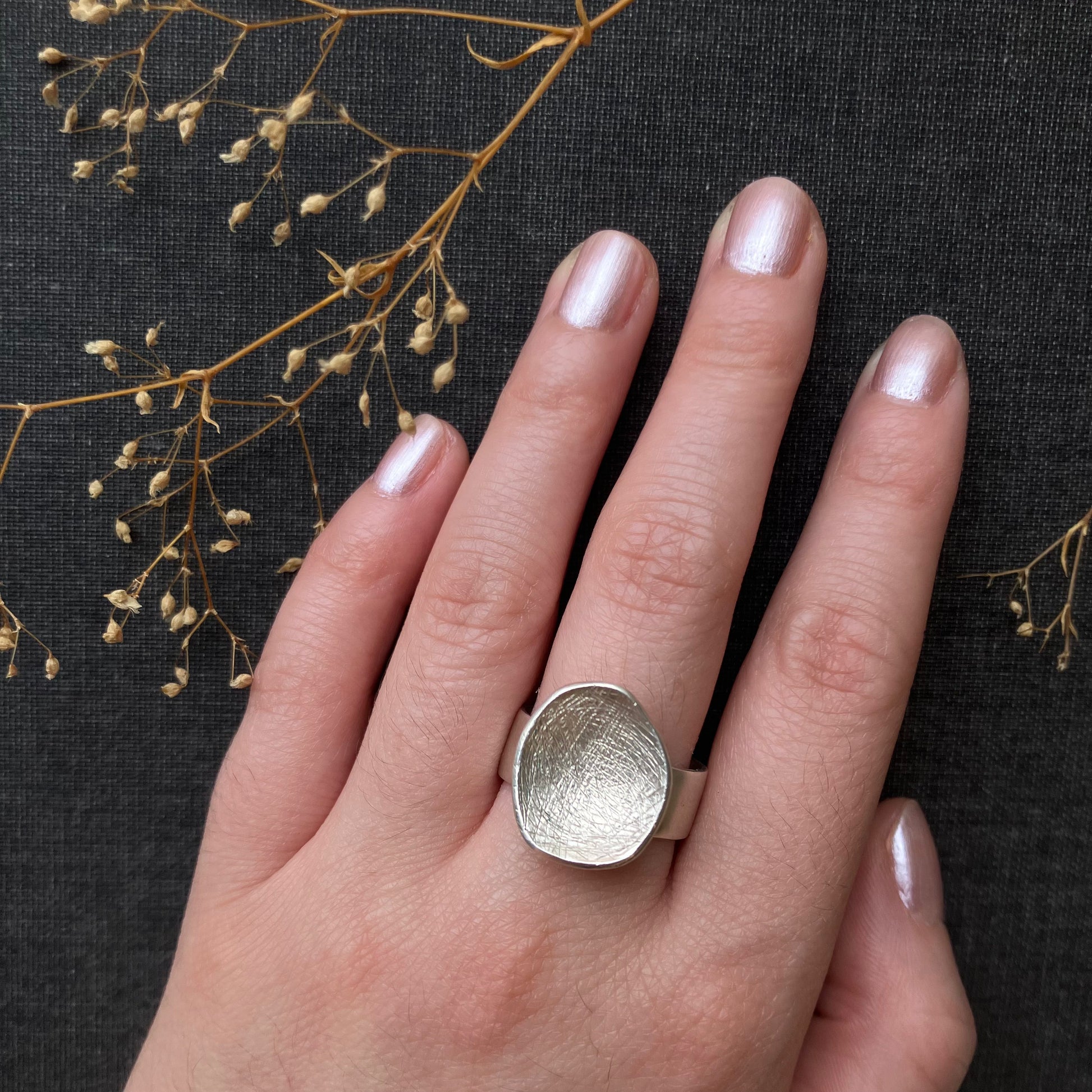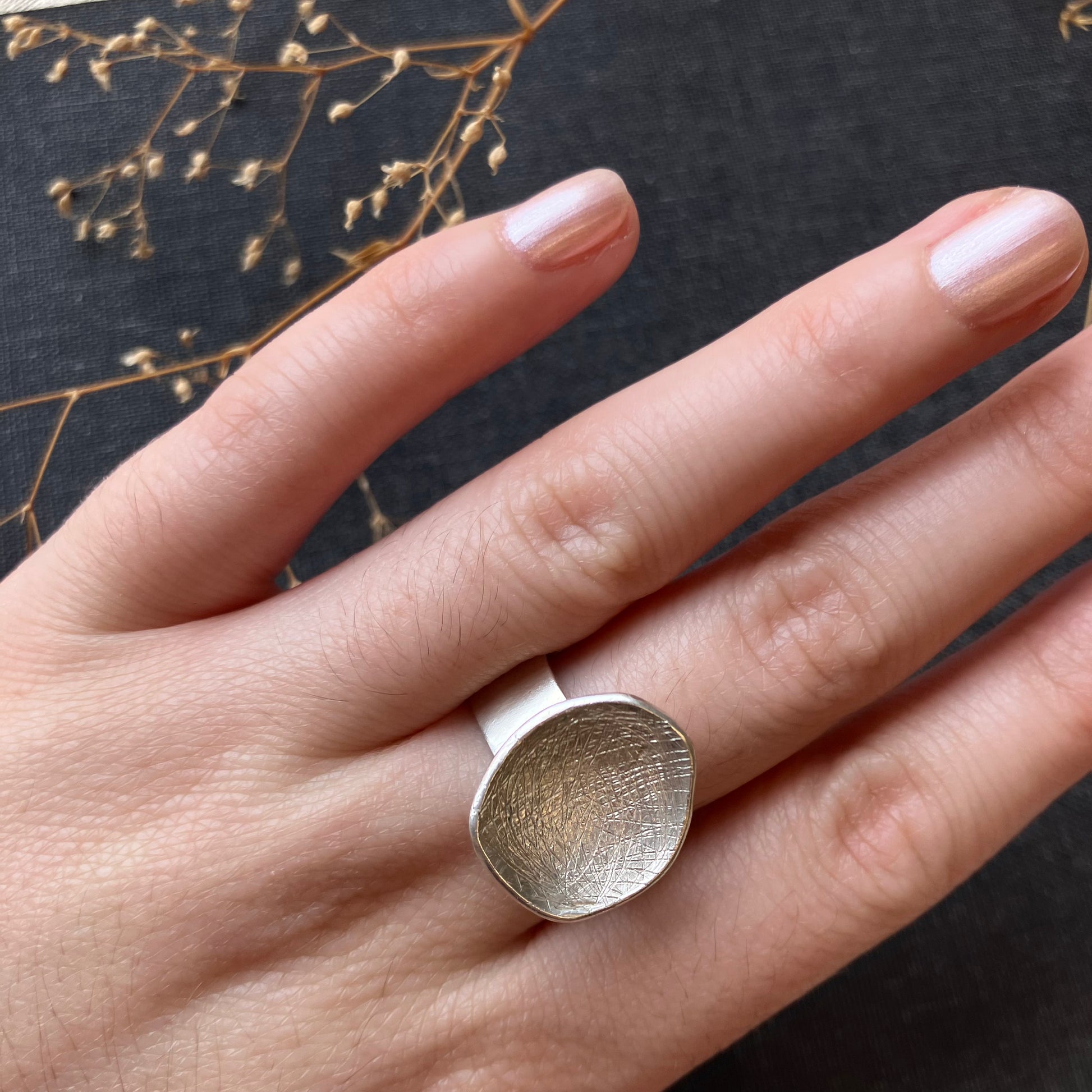 Sterling silver textured cup ring on a wide sterling silver flat square band