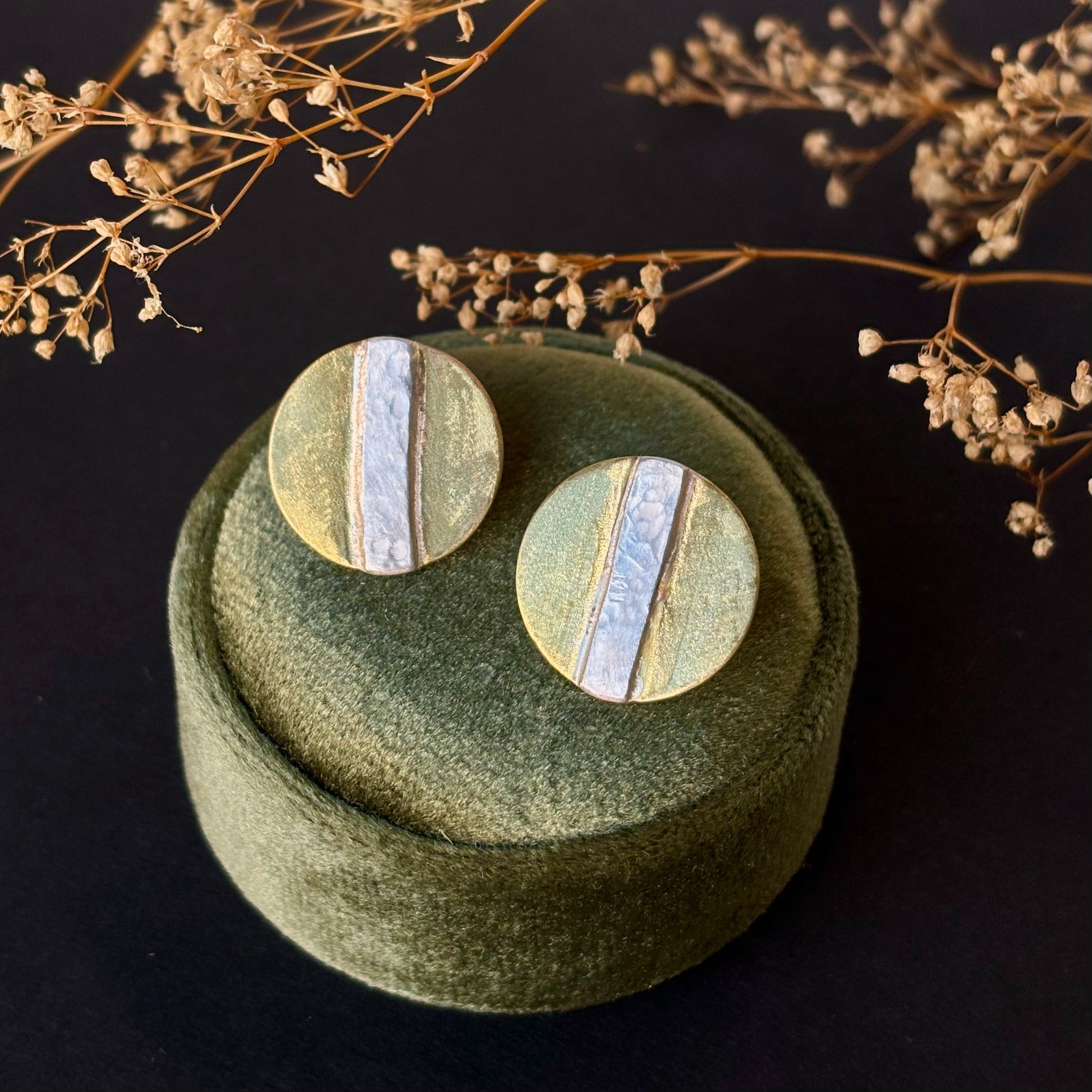 Brass circles with vertical sterling silver applique on sterling silver ear hooks