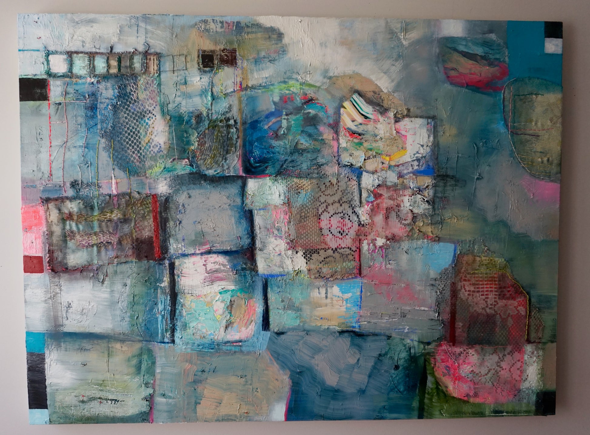 Oil, embroidered raw canvas, lace table cloth, shirt remnant hand stitched on canvas