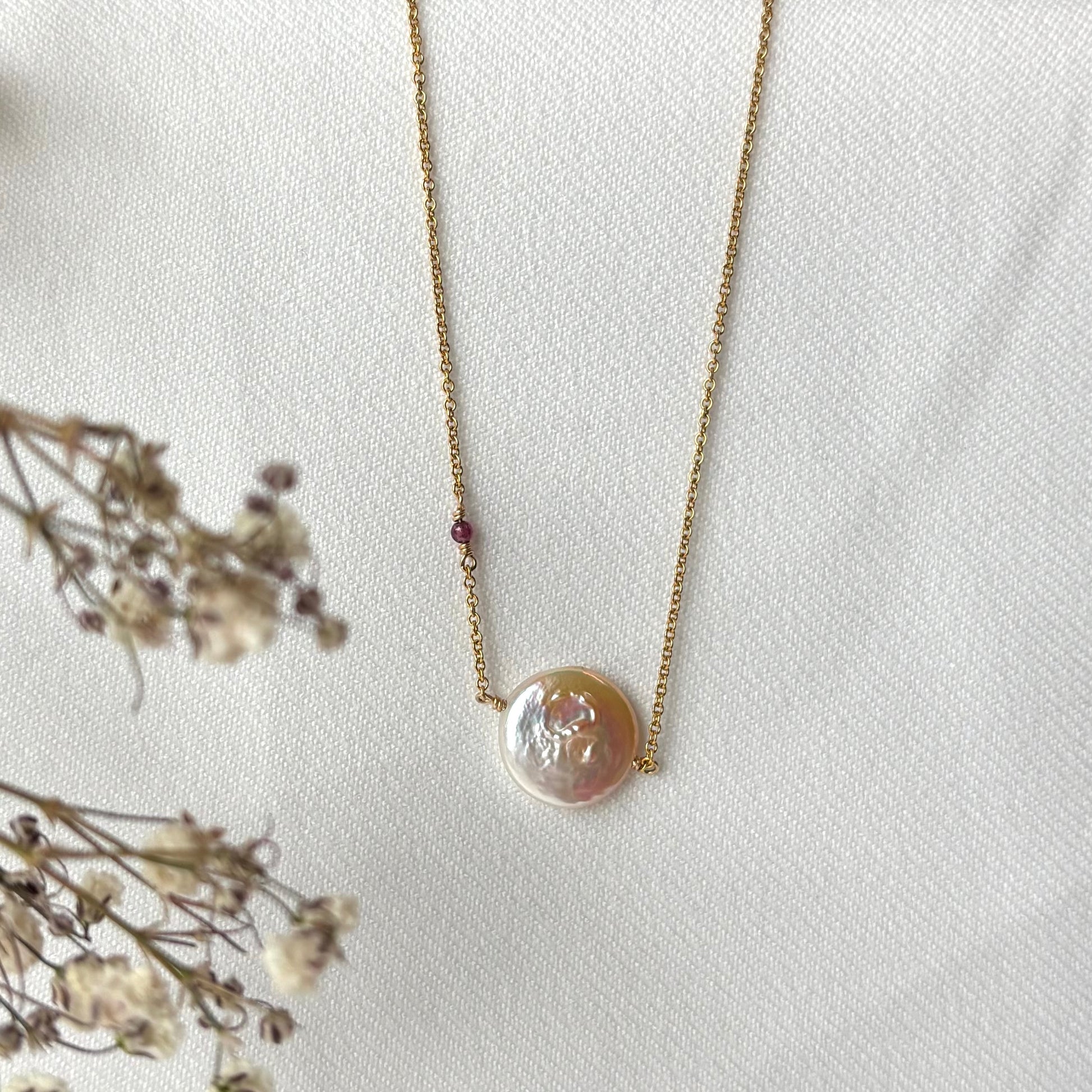 Freshwater pearl pendant with garnet gemstone accent on a gold filled chain