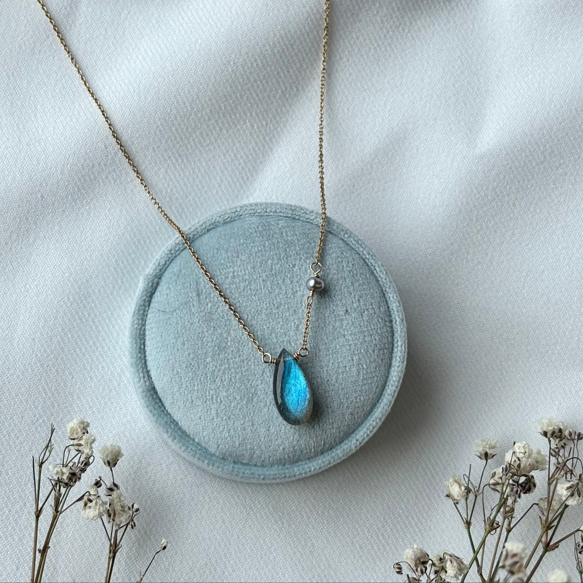 Pear shaped labradorite gemstone on a gold filled chain with small pearl accent.