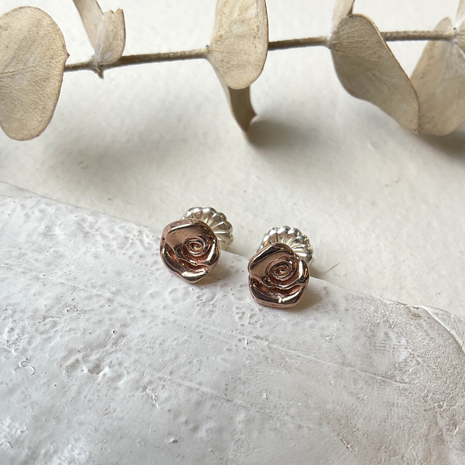 Rose gold plated tiny sterling silver rose stud earrings on a sterling silver stud back