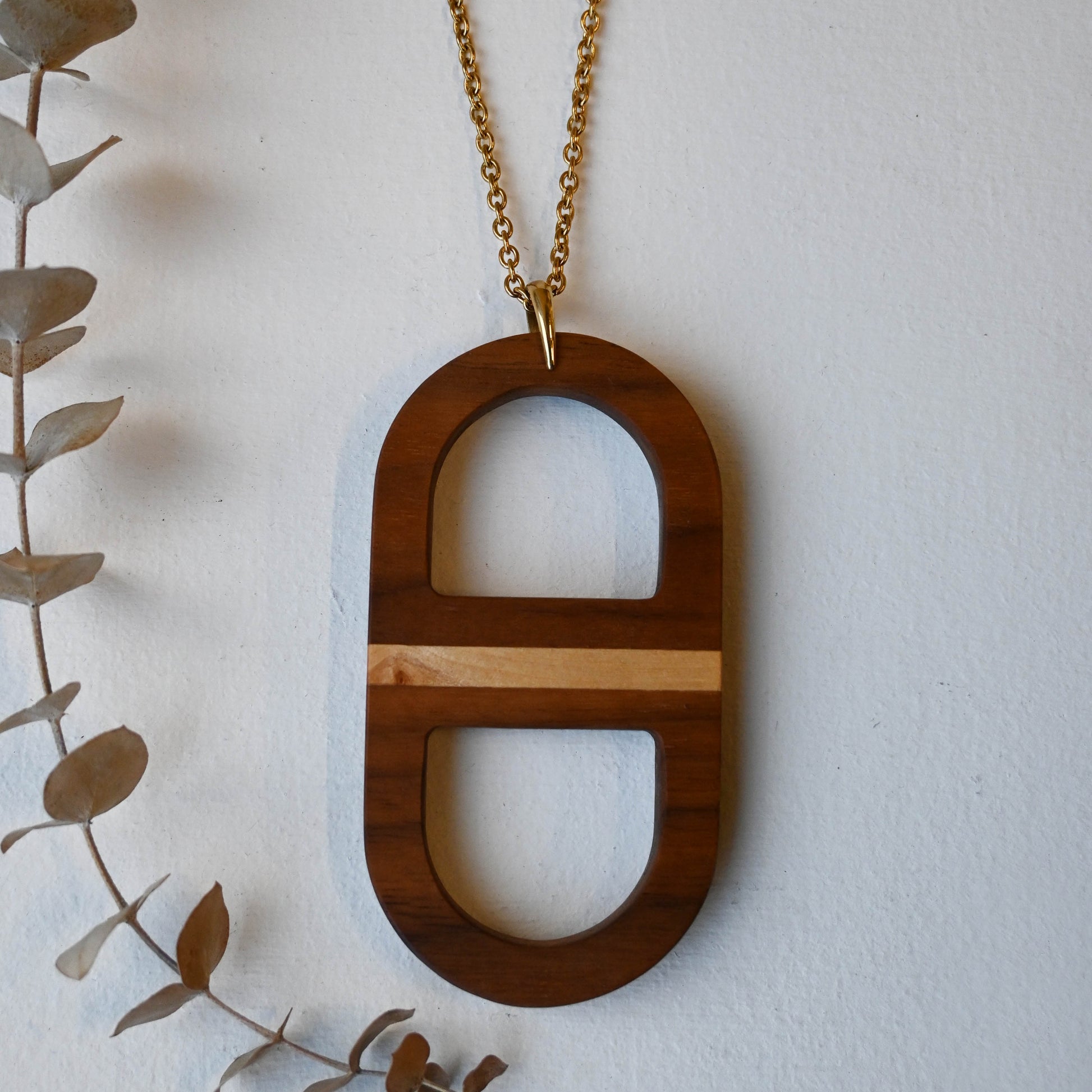 Walnut and maple alloy, brass hanger and gold-plated stainless steel link chain