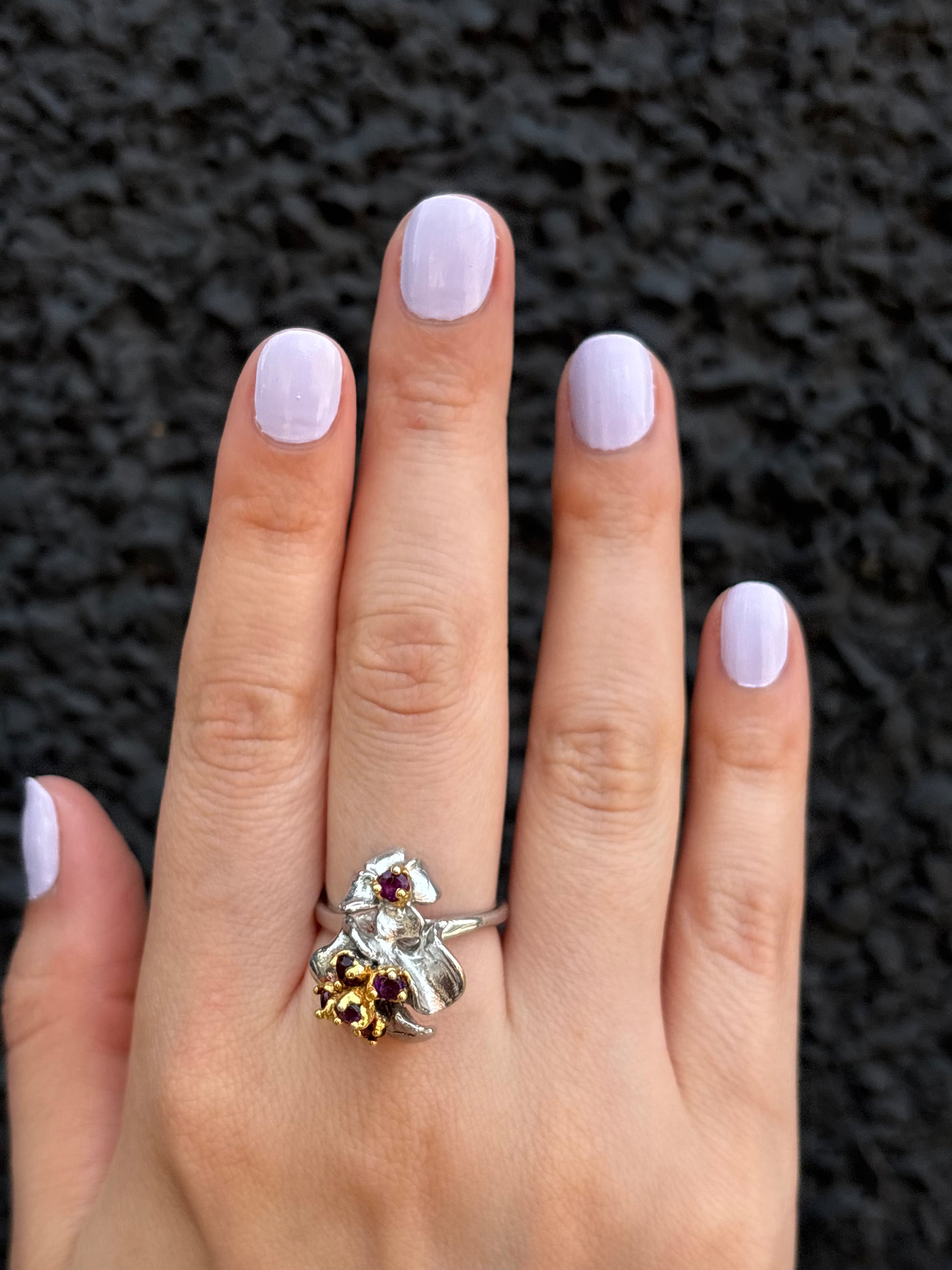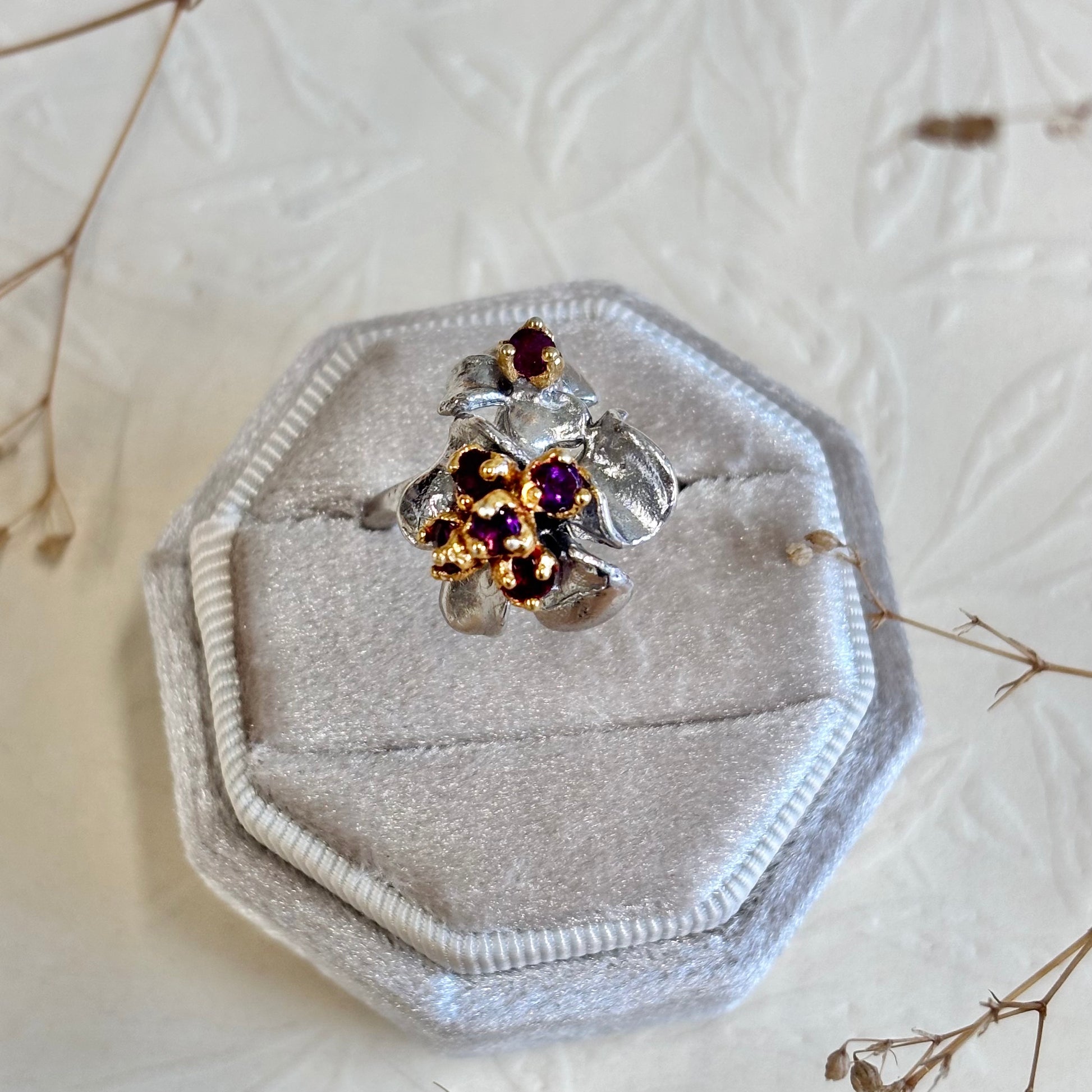 Sterling silver with gold patina floral ring and colour changing garnet gemstones