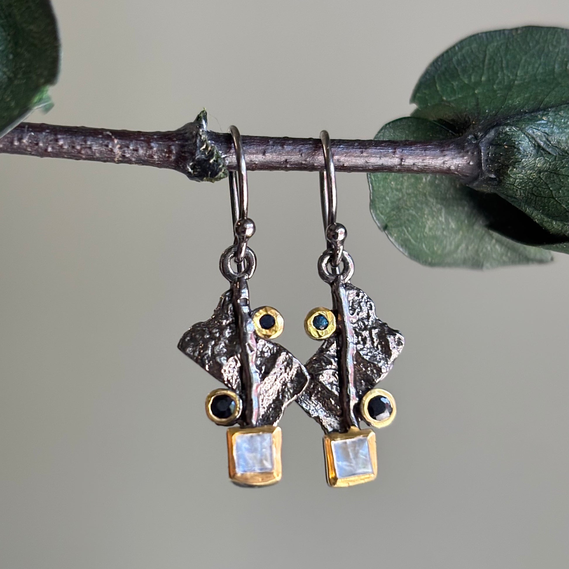Sterling silver black rhodium patina and gold patina with moonstone and blue sapphire gemstone drop dangle earrings