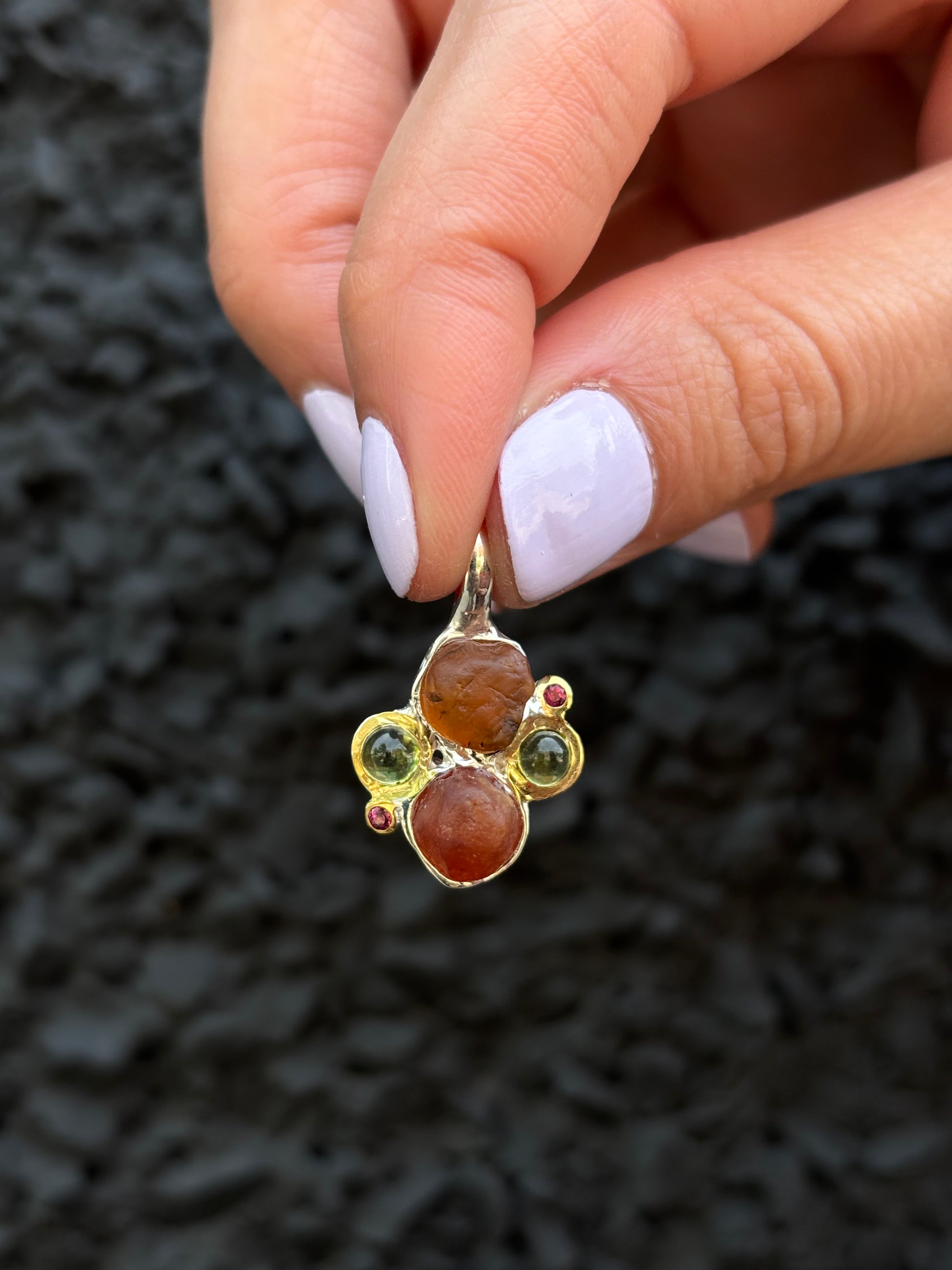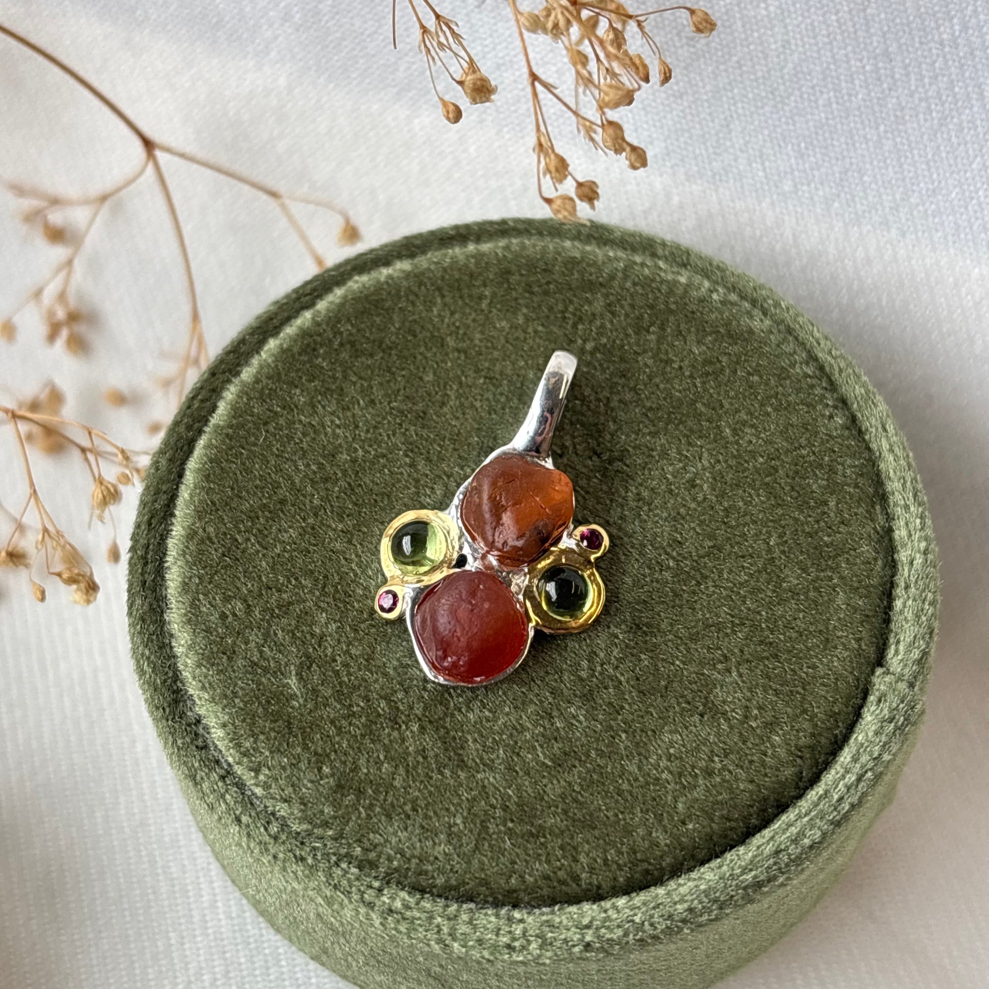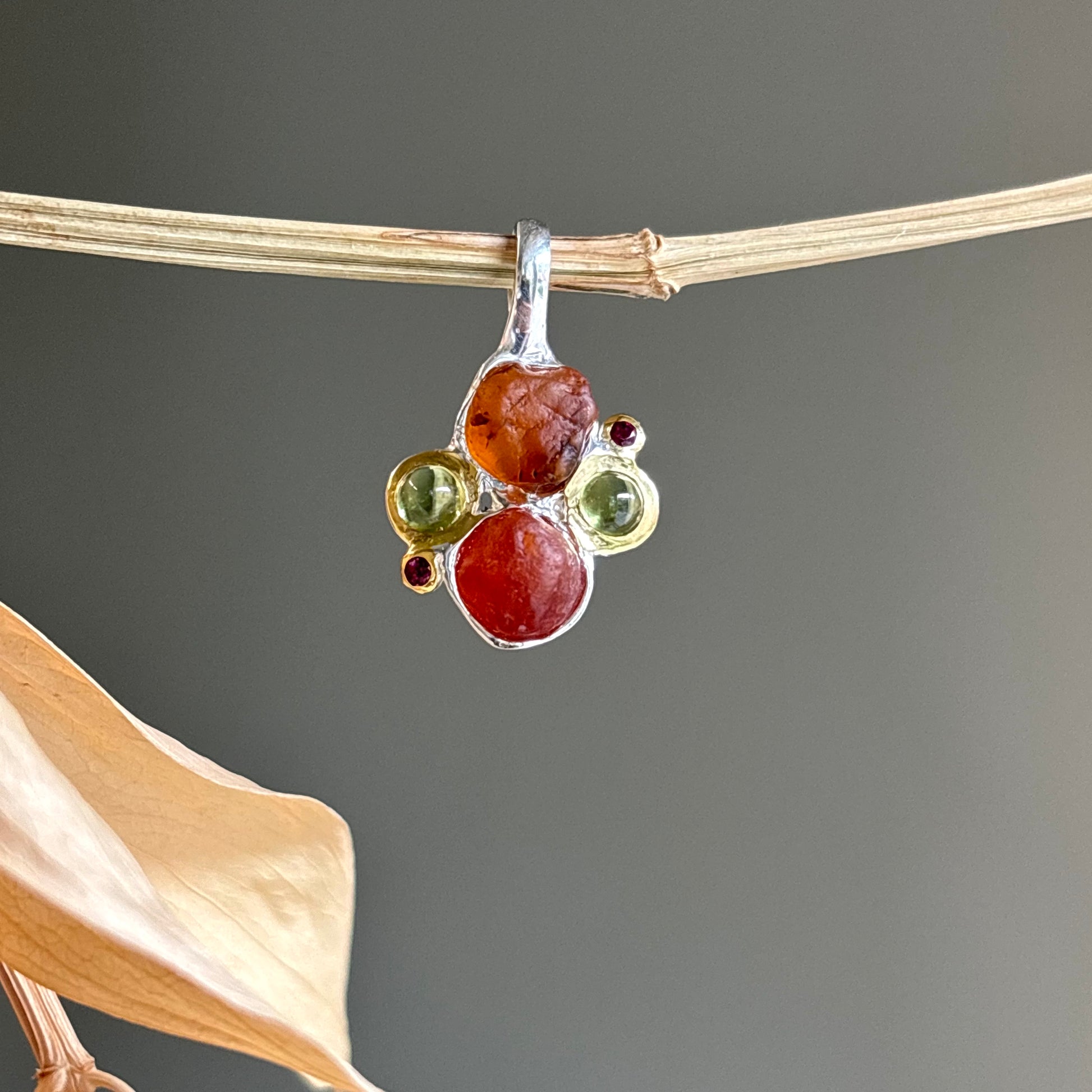 Sterling silver and yellow gold patina pendant with faceted rhodolite garnets, spessartite, and peridot