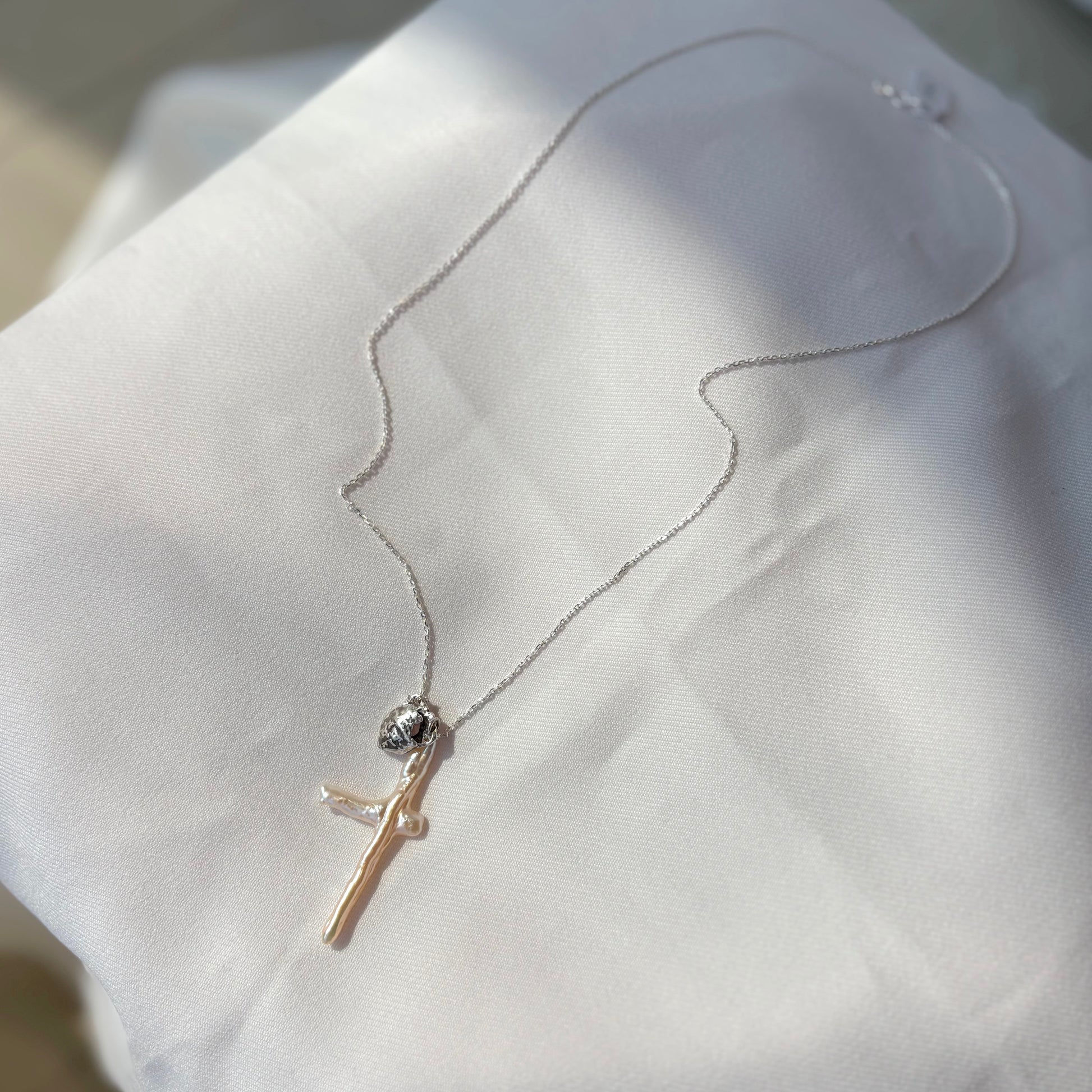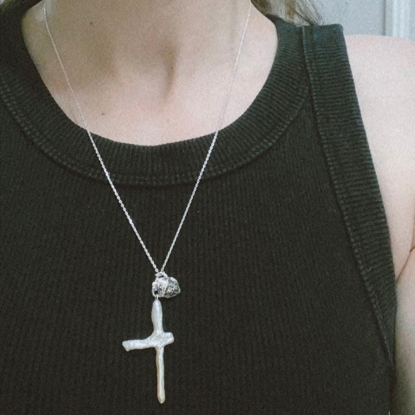 An unearthed windswept urn and a cross-shaped pearl, luminous and ethereal, suspended beneath on a 22" sterling silver chain.