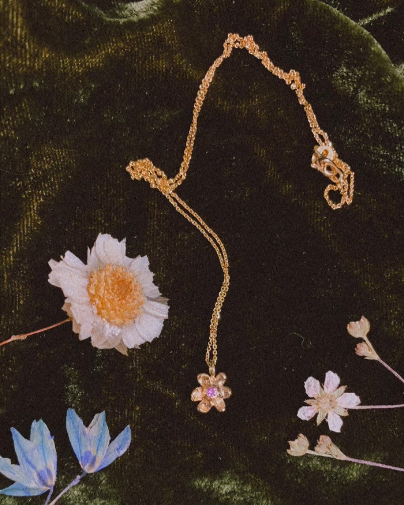 14kt gold wildflower pendant with pink sapphire on a 14kt yellow gold chain.
