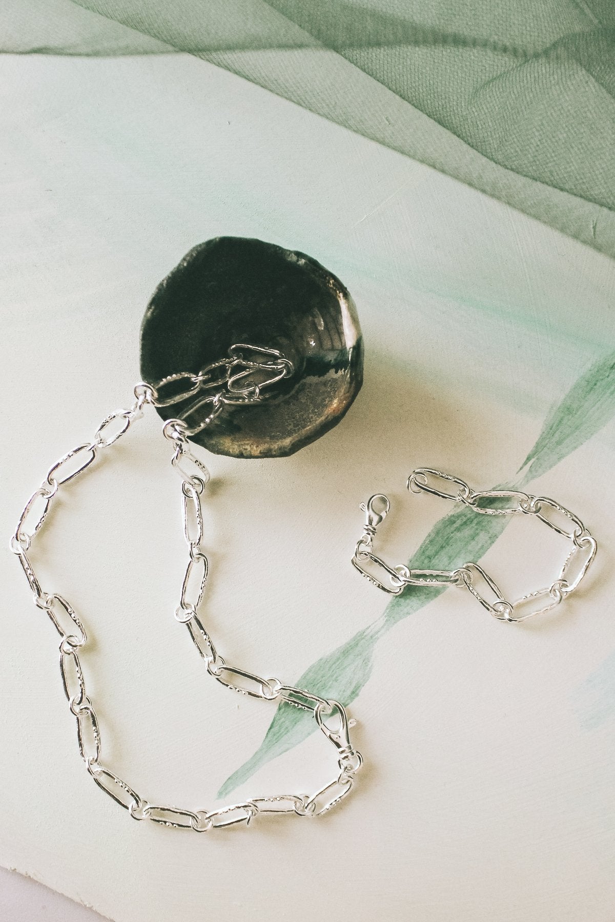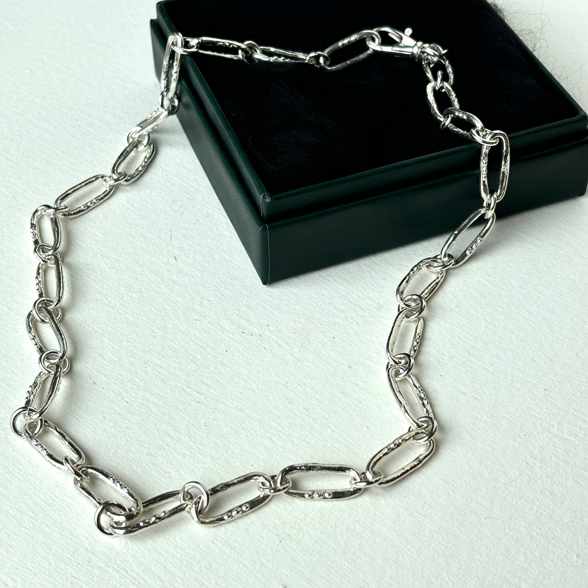 Sterling silver with lobster clasp link chain necklace. A chain link necklace for everyday wear with a comfortable weight, and varying textures on the hand carved and cast links.