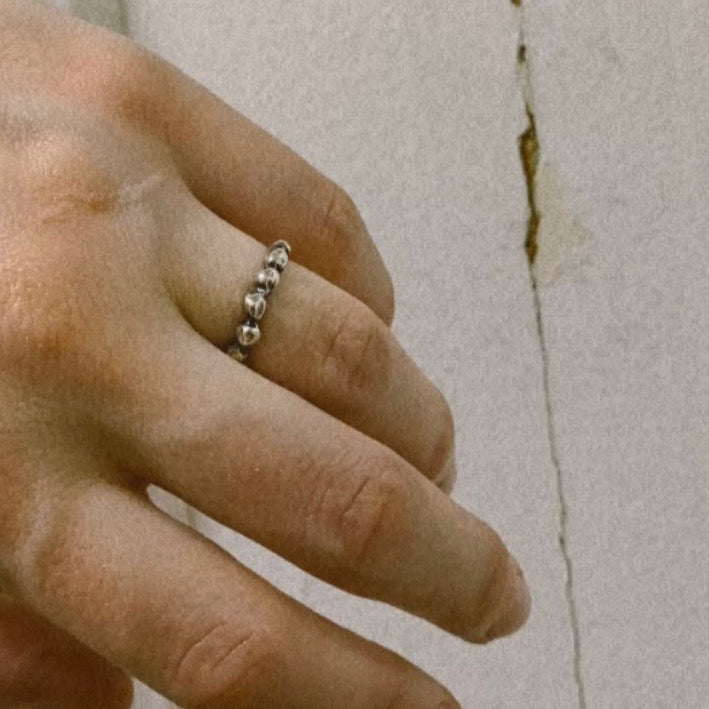 A textured ring that curves and is inspired by the rock formations in Newfoundland that have resisted erosion and the passage of time.