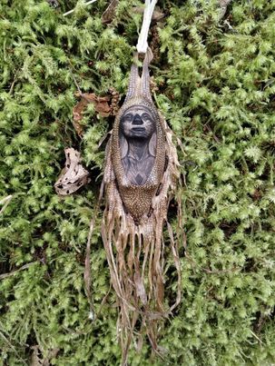 Natural (non commercial) clay finished with conifer soot and beeswax and wood burning details on deer skin rawhide