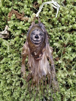 Natural (non commercial) clay finished with conifer soot and beeswax and wood burning details on deer skin rawhide